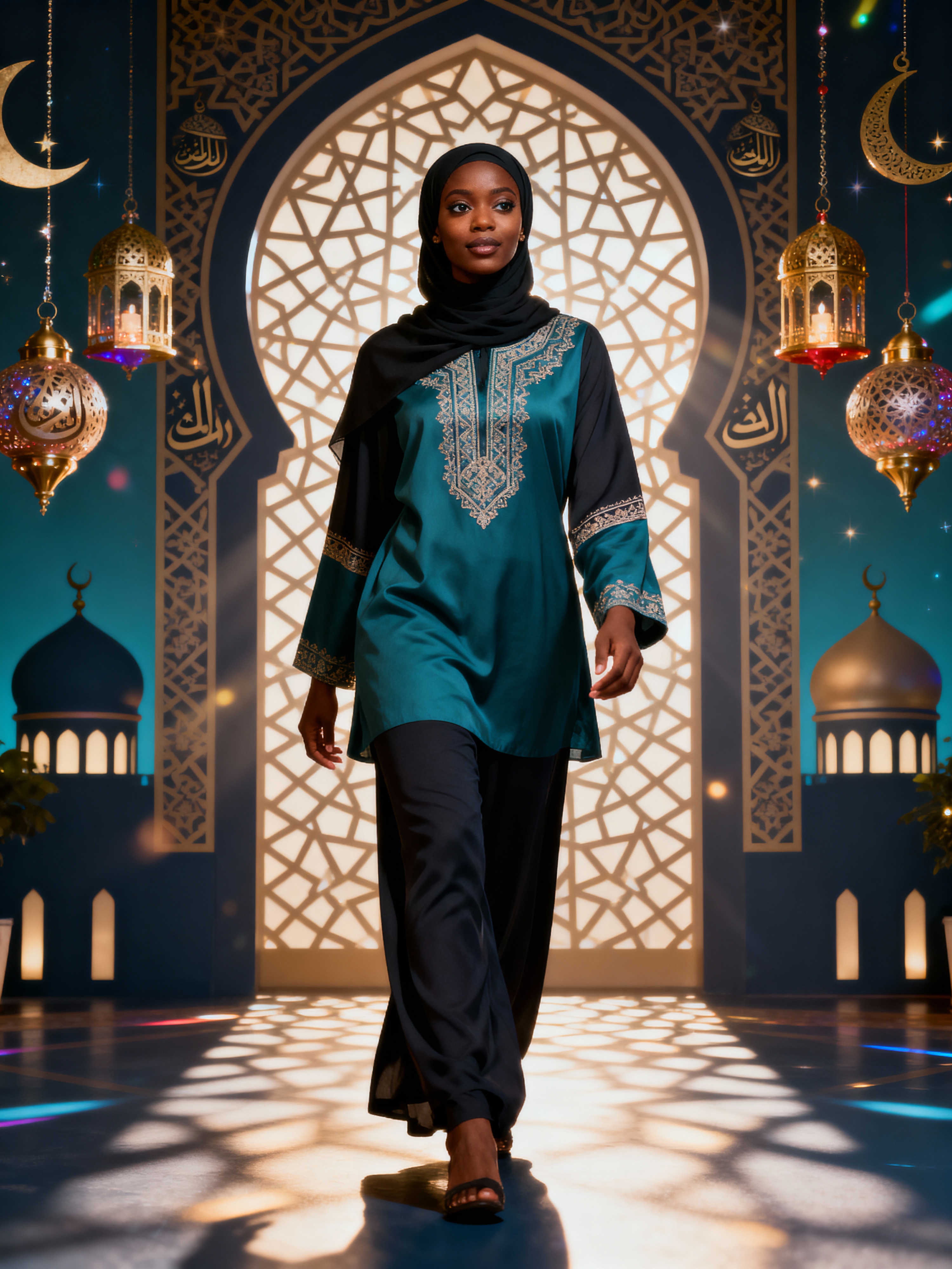 a stunning model in a modern modest outfit with traditional elements , capturing their festive look against a backdrop of Islamic geometric patterns and Eid decorations