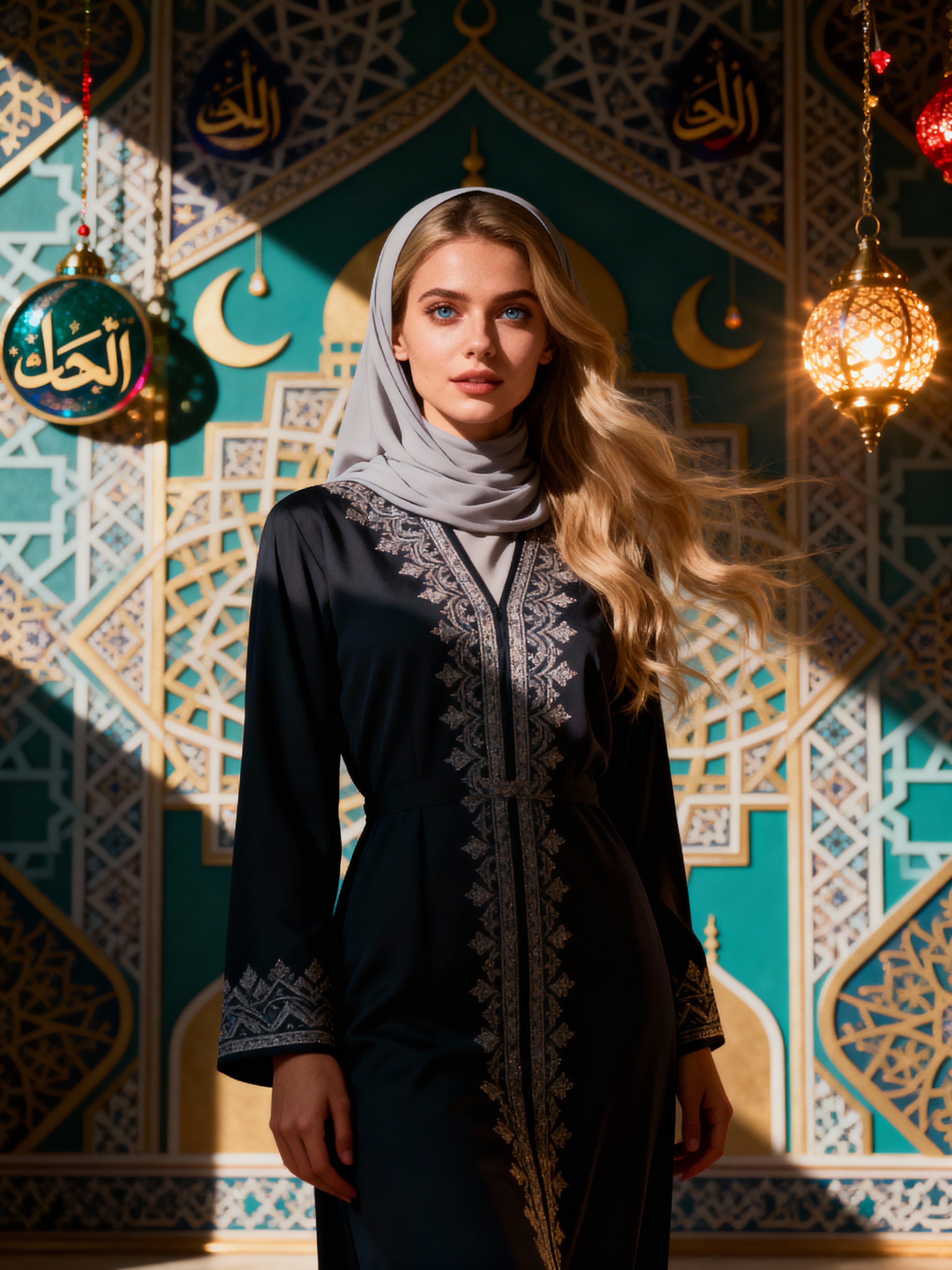 a stunning model in a modern modest outfit with traditional elements , capturing their festive look against a backdrop of Islamic geometric patterns and Eid decorations