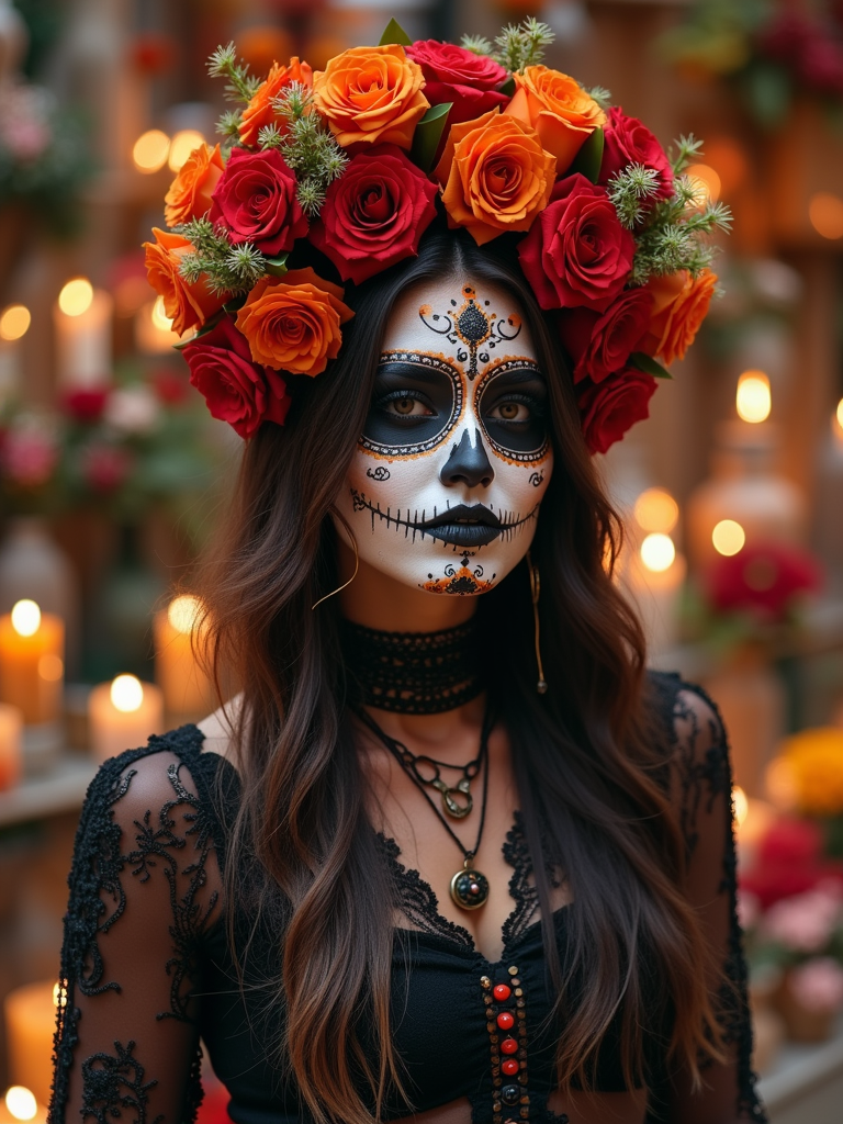 a stunning model in a modern outfit inspired by traditional Day of the Dead elements , capturing their festive look against a backdrop of altars and memorial decorations