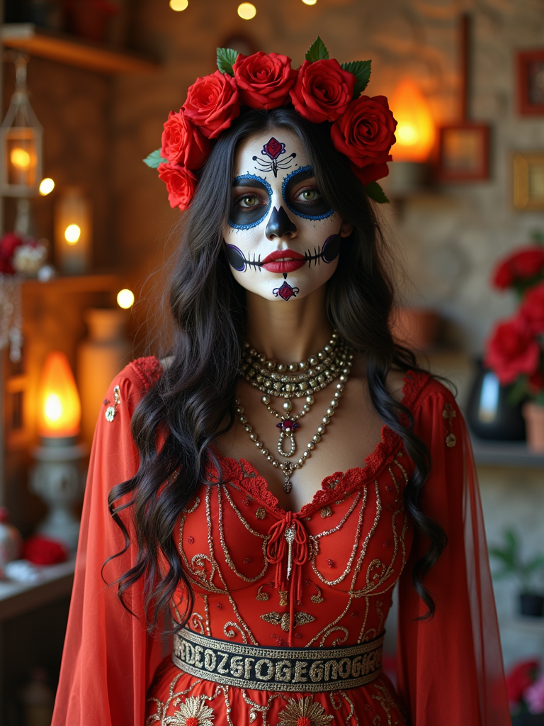 a stunning model in a modern outfit inspired by traditional Day of the Dead elements , capturing their festive look against a backdrop of altars and memorial decorations