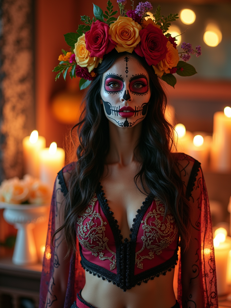a stunning model in a modern outfit inspired by traditional Day of the Dead elements , capturing their festive look against a backdrop of altars and memorial decorations