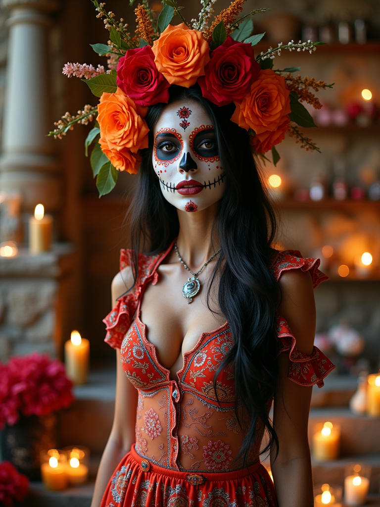 a stunning model in a modern outfit inspired by traditional Day of the Dead elements , capturing their festive look against a backdrop of altars and memorial decorations