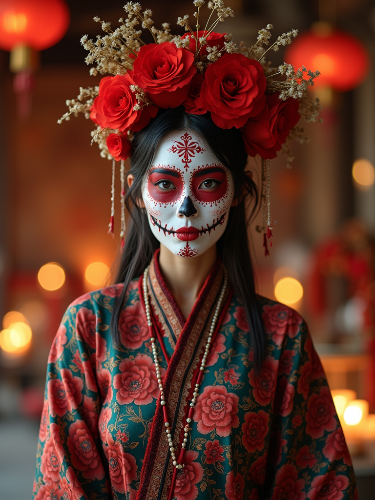 a stunning model in a modern outfit inspired by traditional Day of the Dead elements , capturing their festive look against a backdrop of altars and memorial decorations