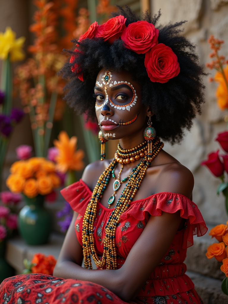 a stunning model in a modern outfit inspired by traditional Day of the Dead elements , capturing their festive look against a backdrop of altars and memorial decorations