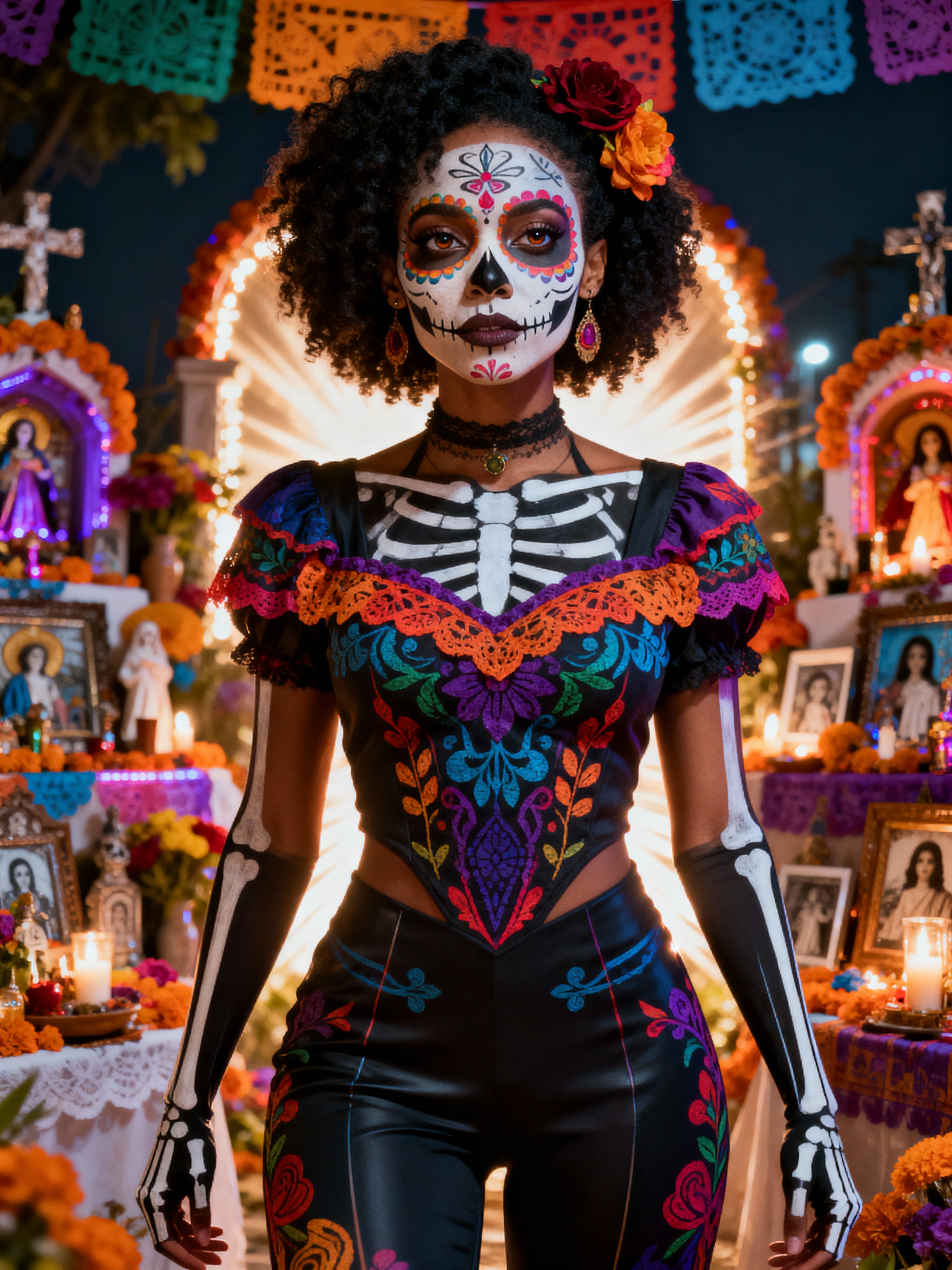 a stunning model in a modern outfit inspired by traditional Day of the Dead elements , capturing their festive look against a backdrop of altars and memorial decorations
