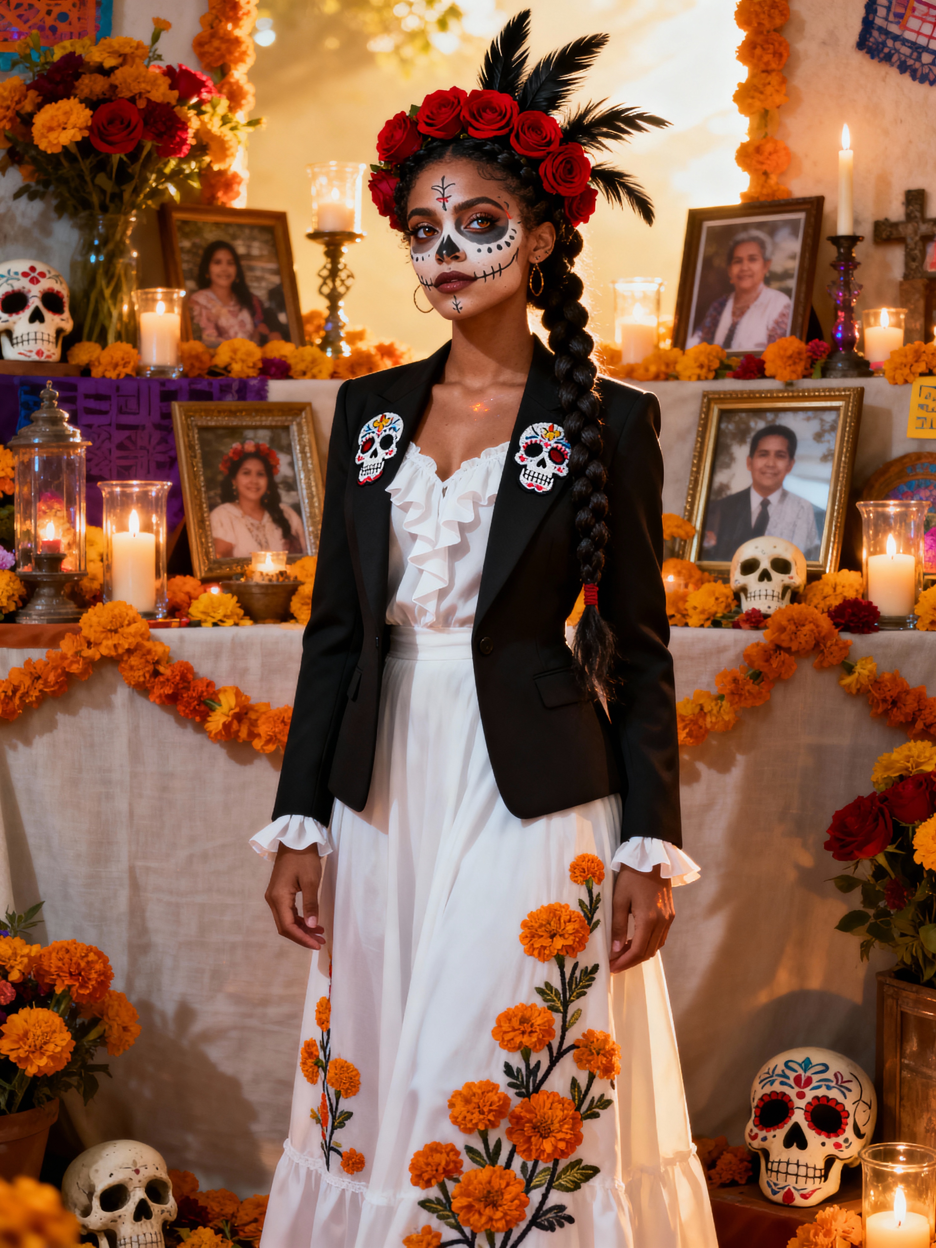 a stunning model in a modern outfit inspired by traditional Day of the Dead elements , capturing their festive look against a backdrop of altars and memorial decorations