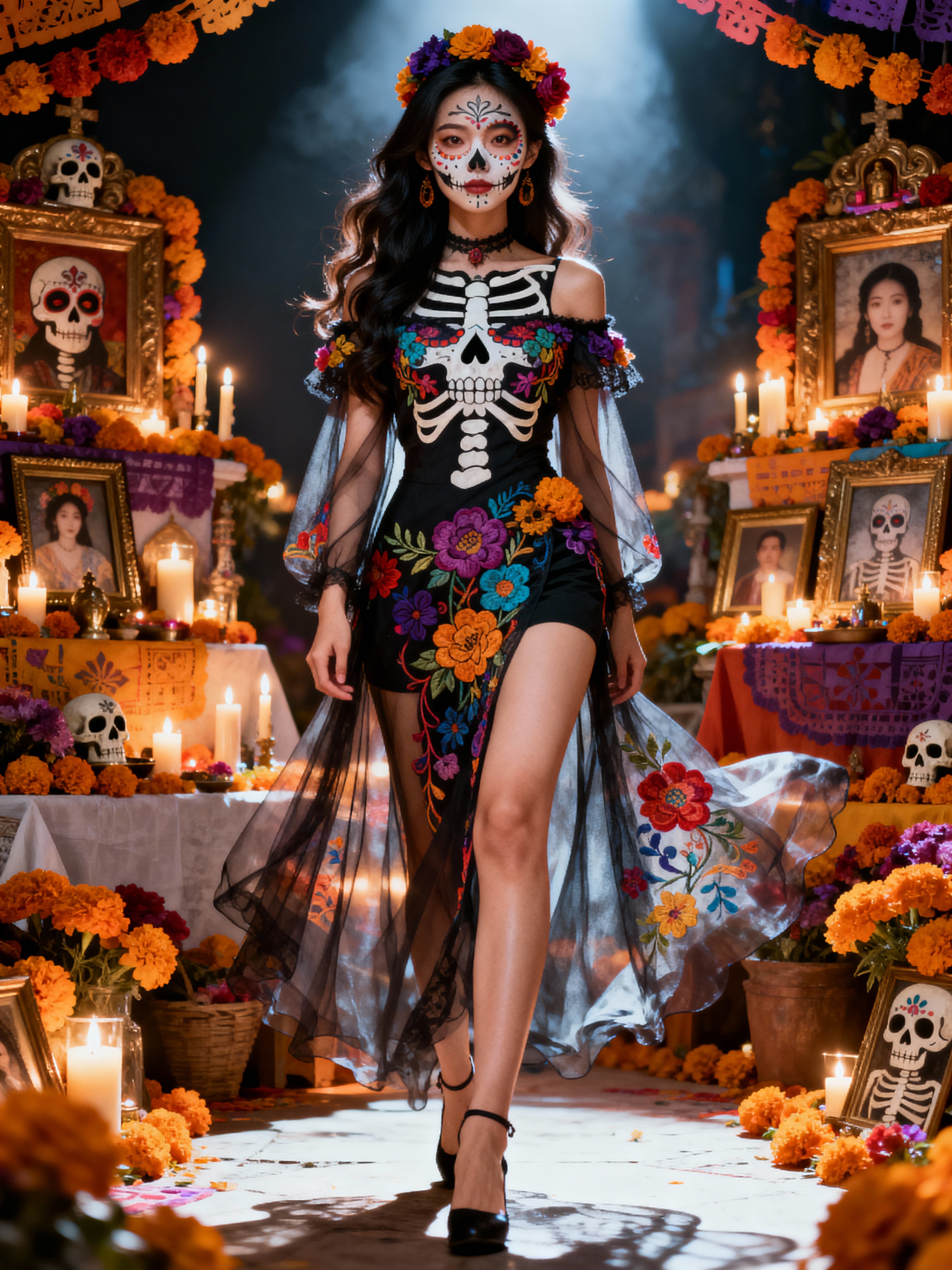 a stunning model in a modern outfit inspired by traditional Day of the Dead elements , capturing their festive look against a backdrop of altars and memorial decorations