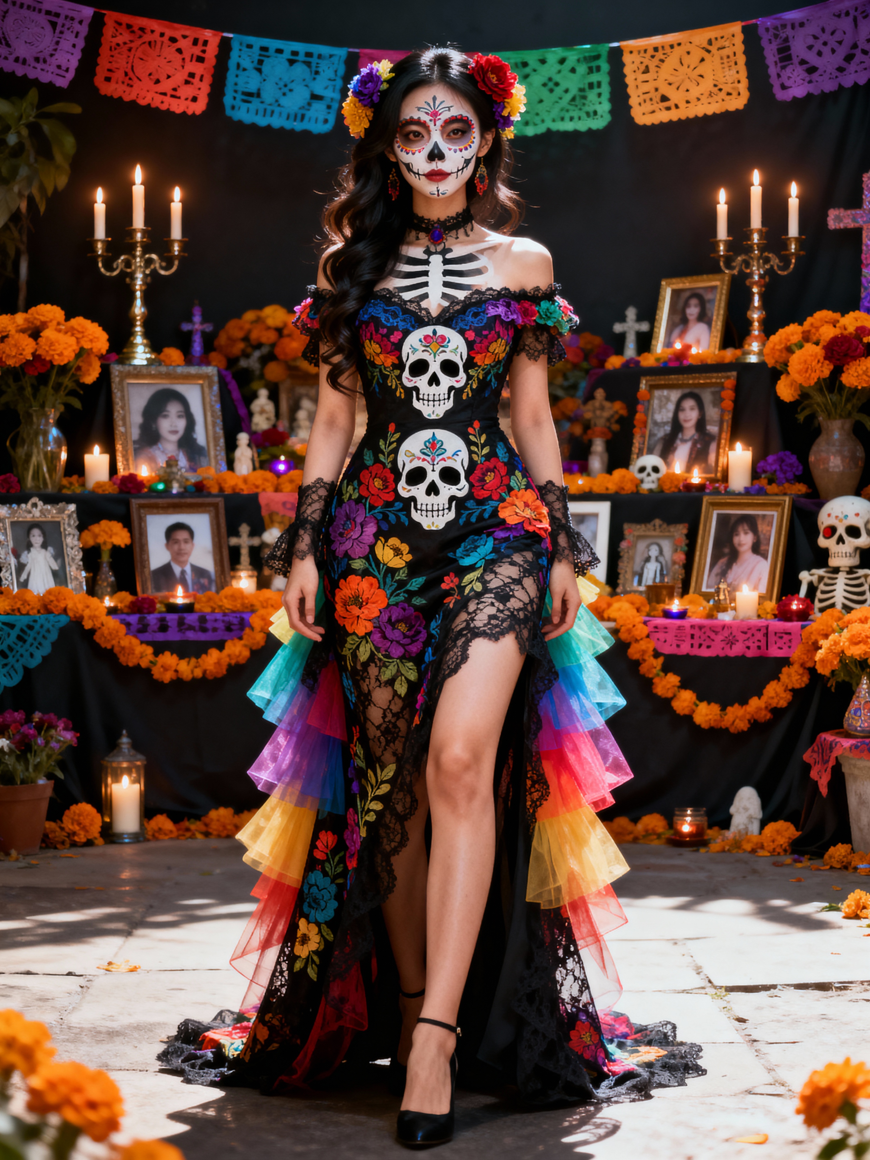 a stunning model in a modern outfit inspired by traditional Day of the Dead elements , capturing their festive look against a backdrop of altars and memorial decorations