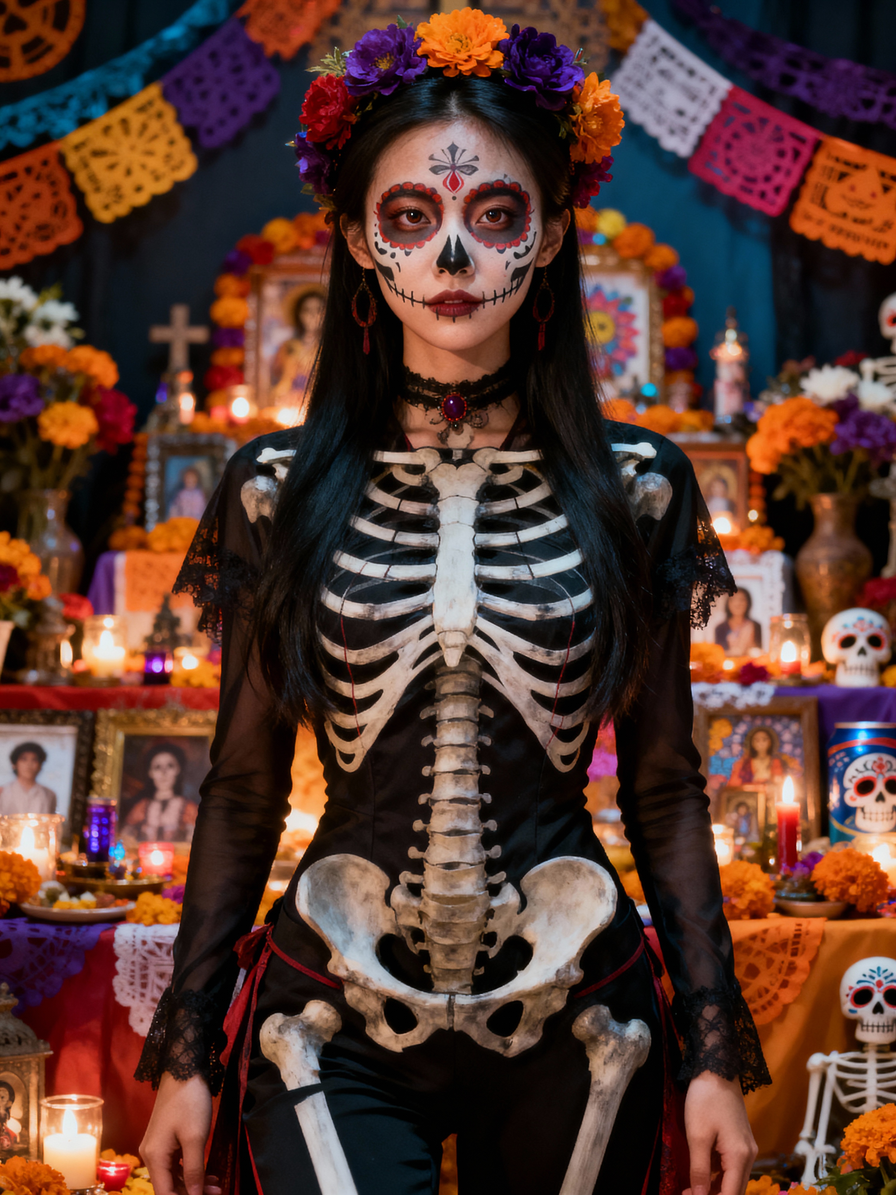 a stunning model in a modern outfit inspired by traditional Day of the Dead elements , capturing their festive look against a backdrop of altars and memorial decorations