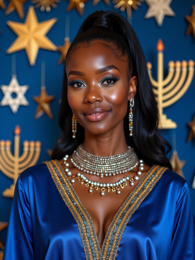 a stunning model in a modern outfit with traditional blue and gold elements , capturing their festive look against a backdrop of Hanukkah symbols and decorations