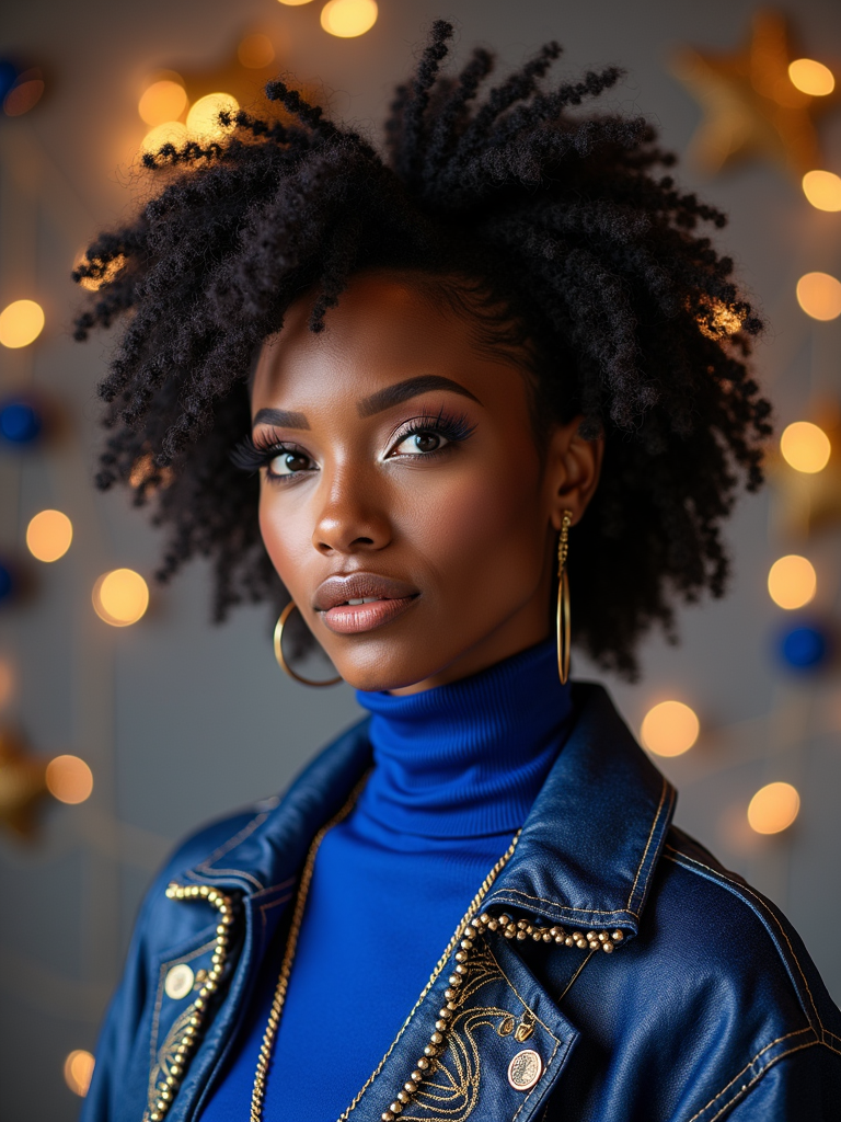 a stunning model in a modern outfit with traditional blue and gold elements , capturing their festive look against a backdrop of Hanukkah symbols and decorations