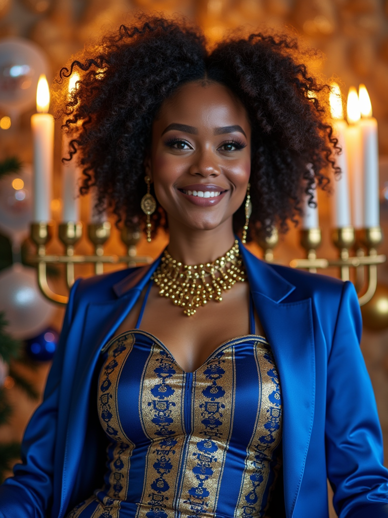 a stunning model in a modern outfit with traditional blue and gold elements , capturing their festive look against a backdrop of Hanukkah symbols and decorations