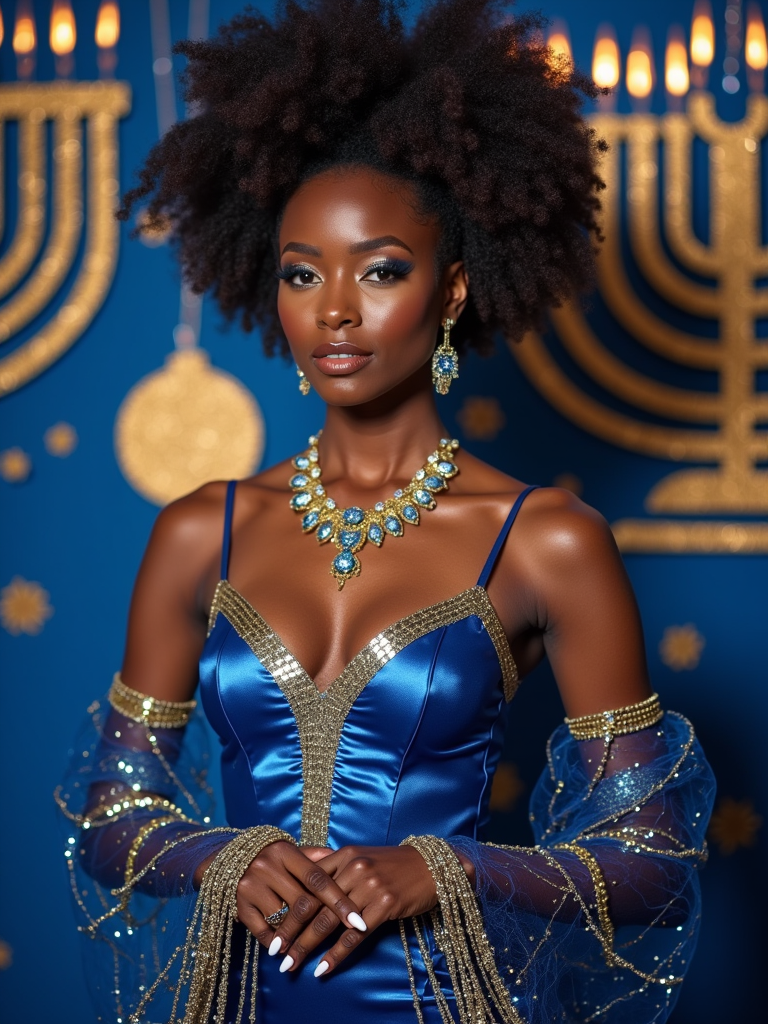 a stunning model in a modern outfit with traditional blue and gold elements , capturing their festive look against a backdrop of Hanukkah symbols and decorations