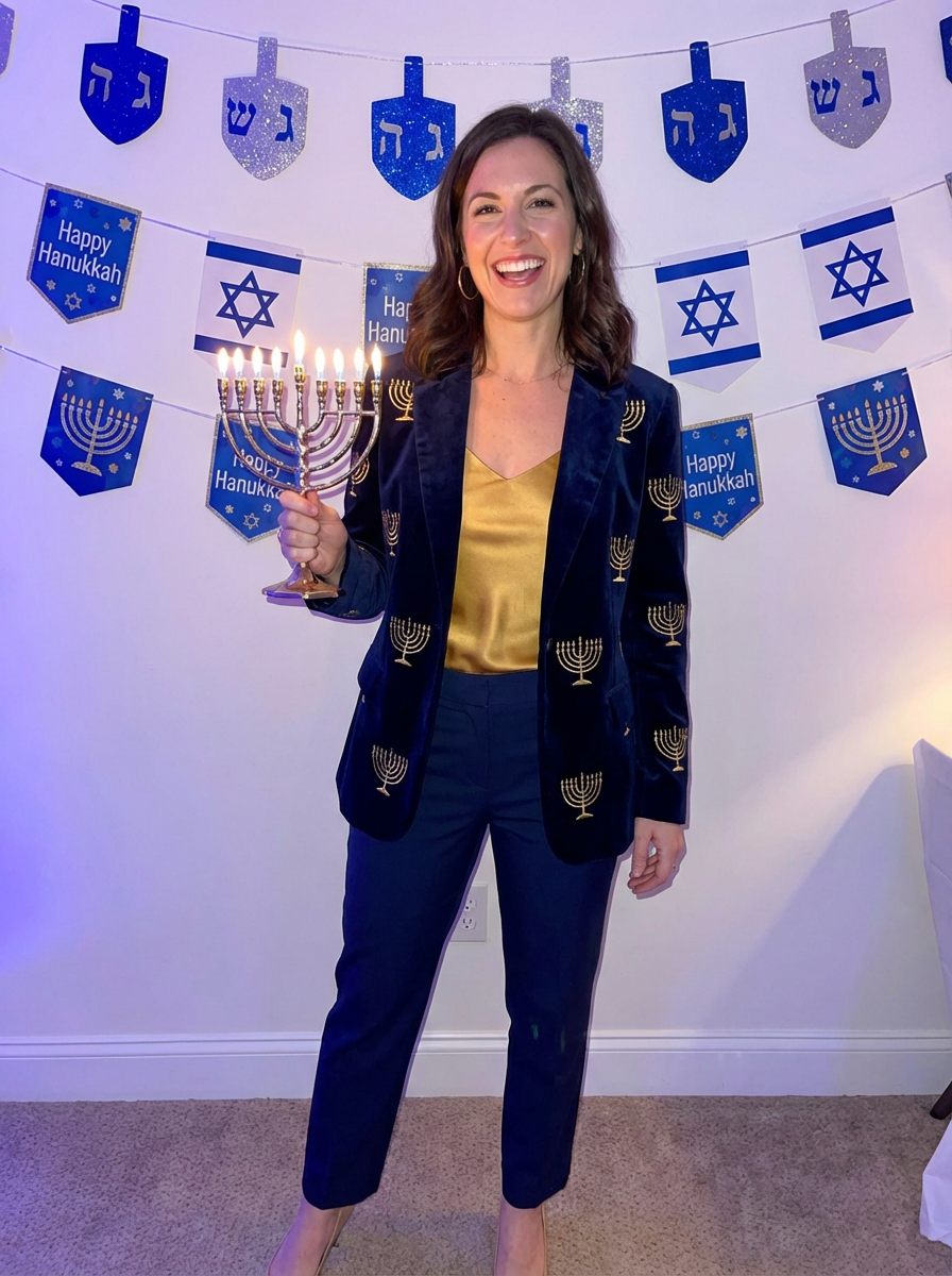a stunning model in a modern outfit with traditional blue and gold elements , capturing their festive look against a backdrop of Hanukkah symbols and decorations