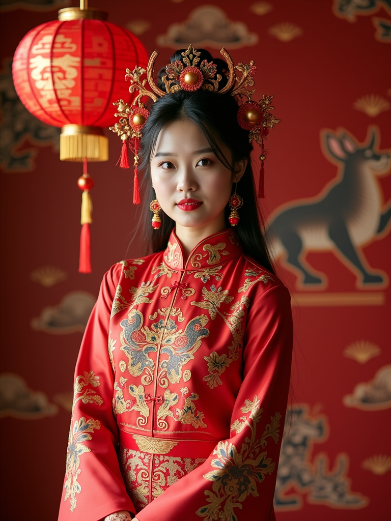 a stunning model in a modern take on traditional Chinese attire , capturing their festive look against a backdrop of Chinese zodiac symbols and Chinese New Year decorations