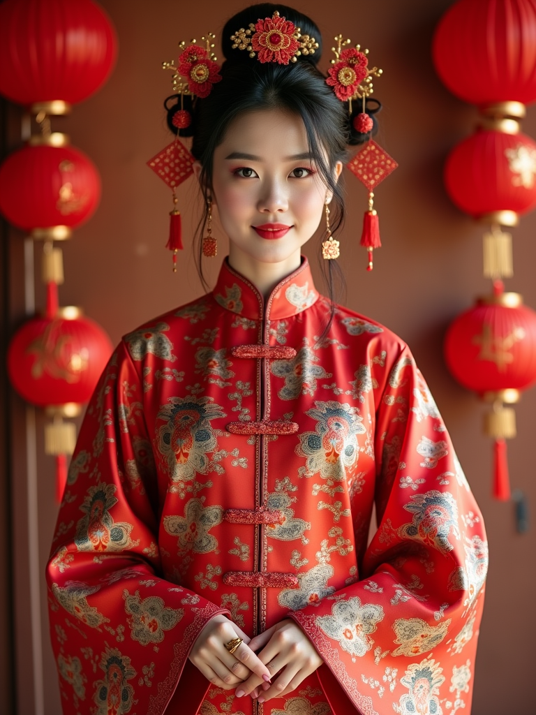 a stunning model in a modern take on traditional Chinese attire , capturing their festive look against a backdrop of Chinese zodiac symbols and Chinese New Year decorations