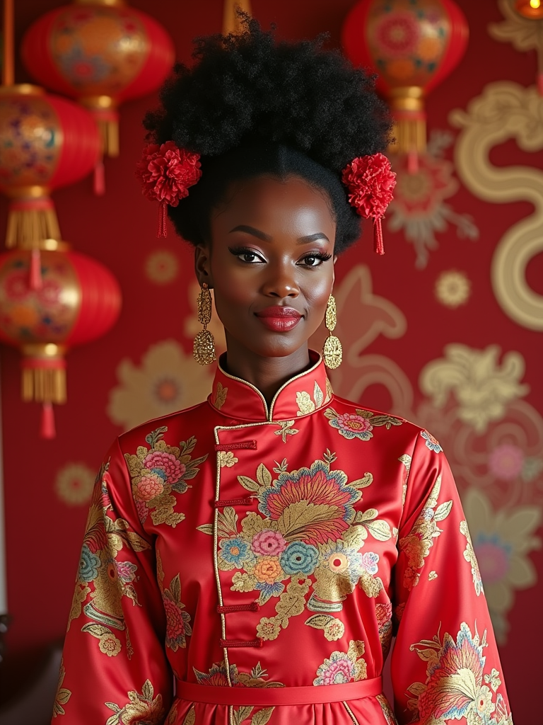 a stunning model in a modern take on traditional Chinese attire , capturing their festive look against a backdrop of Chinese zodiac symbols and Chinese New Year decorations