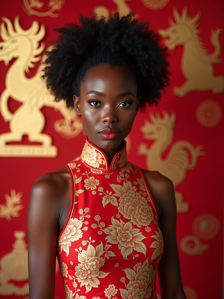 a stunning model in a modern take on traditional Chinese attire , capturing their festive look against a backdrop of Chinese zodiac symbols and Chinese New Year decorations