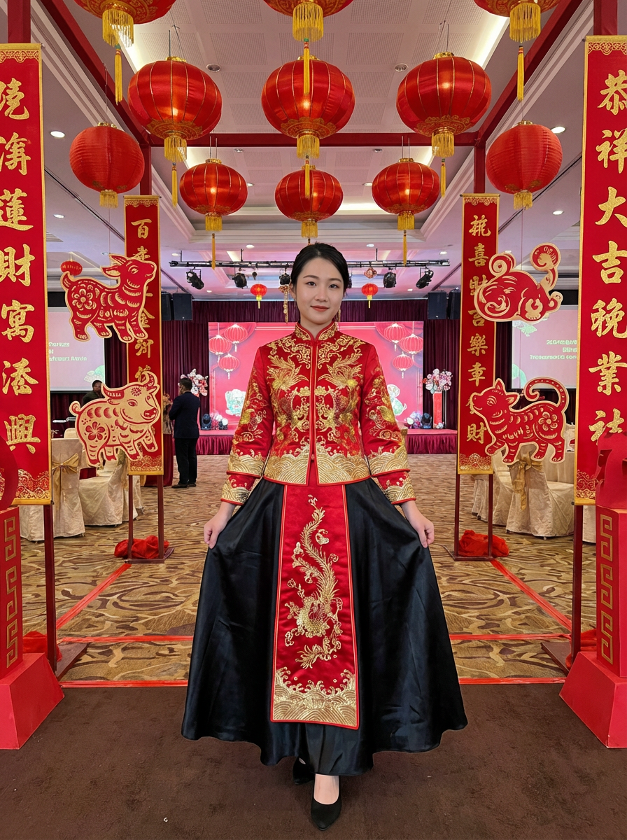 a stunning model in a modern take on traditional Chinese attire , capturing their festive look against a backdrop of Chinese zodiac symbols and Chinese New Year decorations