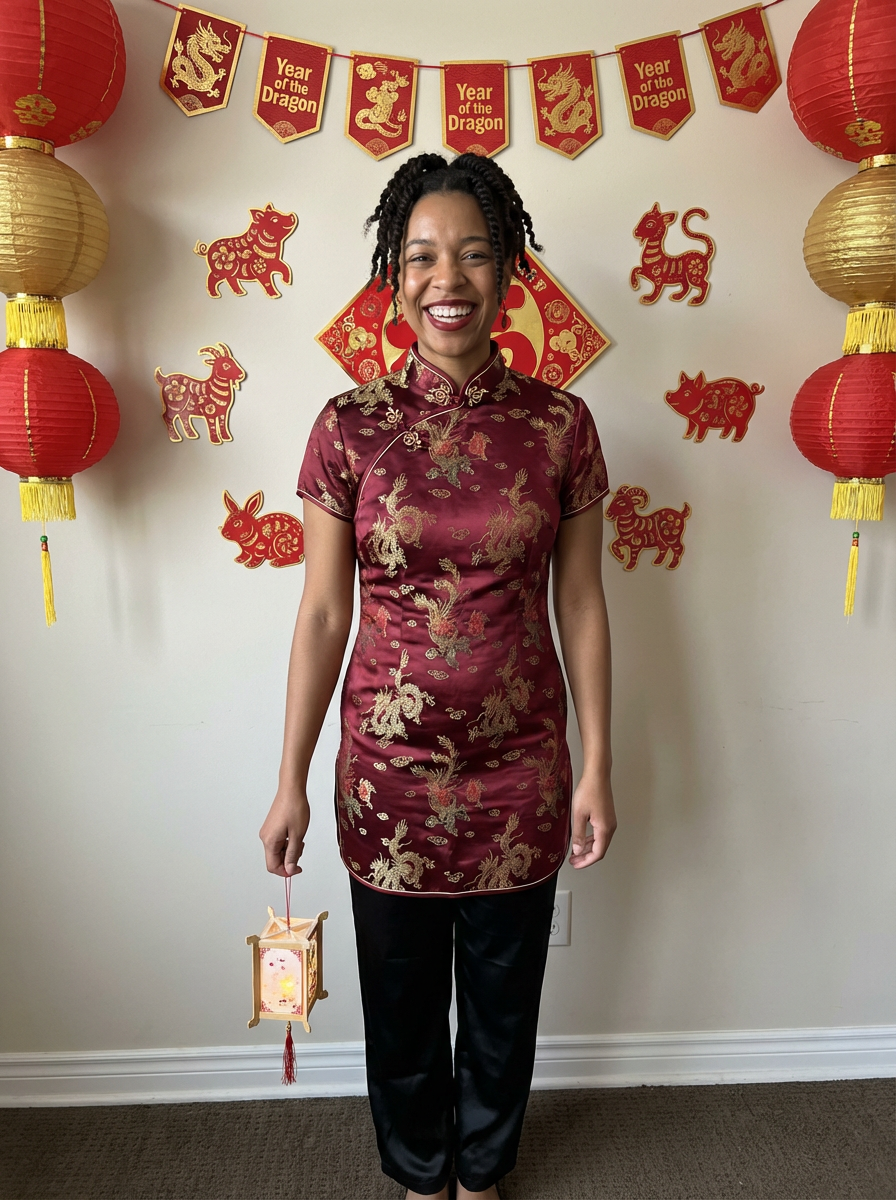 a stunning model in a modern take on traditional Chinese attire , capturing their festive look against a backdrop of Chinese zodiac symbols and Chinese New Year decorations