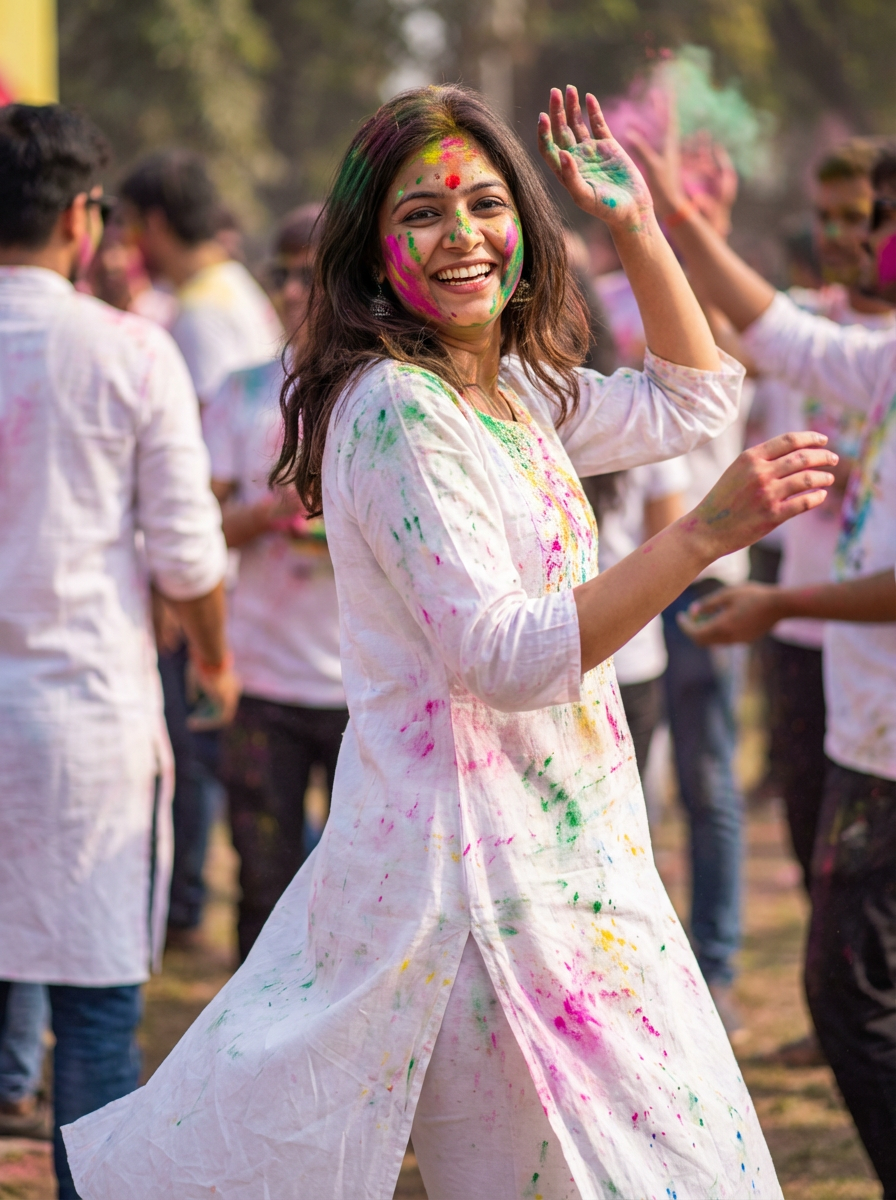 a stunning model in a simple white dress now splashed with Holi colors , embodying the transformation and renewal symbolism of the Holi festival