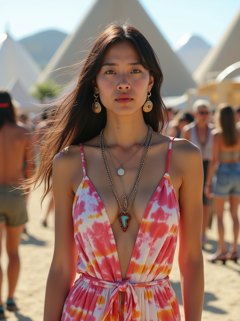 a stunning model in a tie-dye jumpsuit and statement accessories , capturing their eclectic Coachella look against the backdrop of art installations
