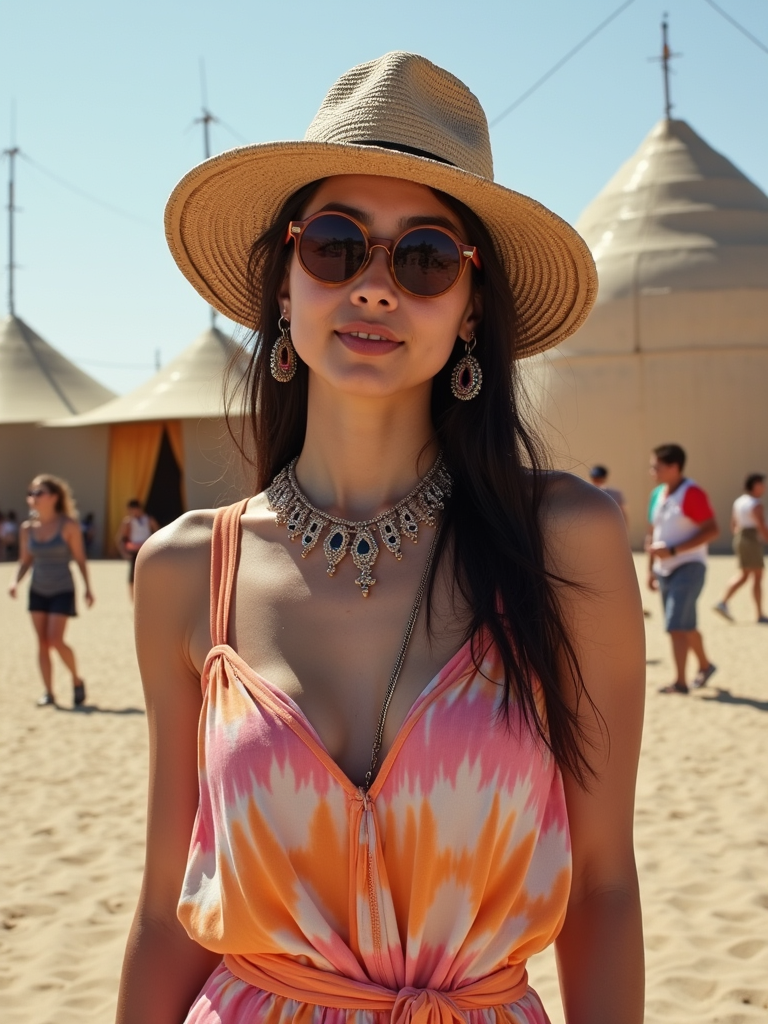 a stunning model in a tie-dye jumpsuit and statement accessories , capturing their eclectic Coachella look against the backdrop of art installations