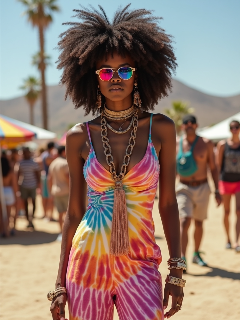 a stunning model in a tie-dye jumpsuit and statement accessories , capturing their eclectic Coachella look against the backdrop of art installations