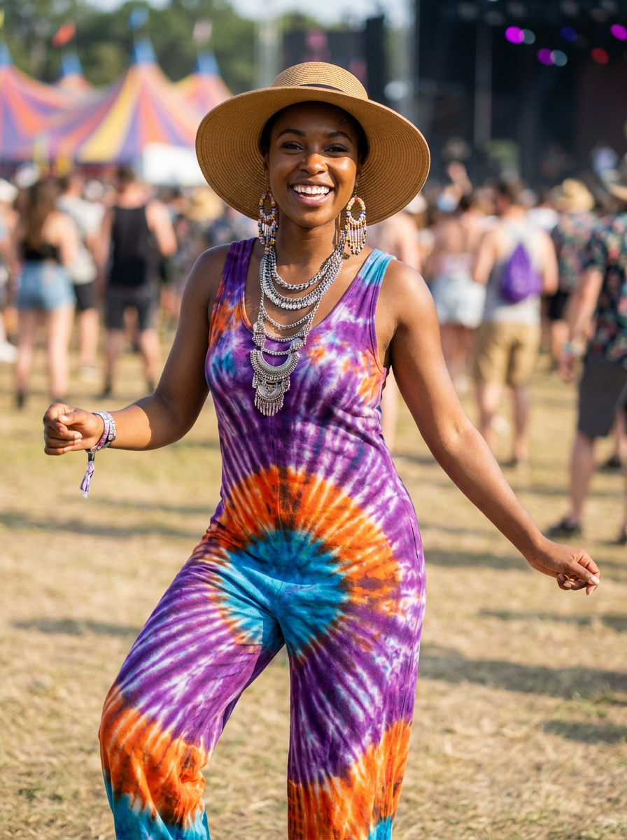a stunning model in a tie-dye jumpsuit and statement accessories , capturing their eclectic and fashionable festival look