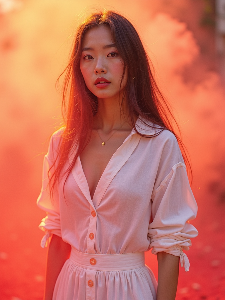a stunning model in a white outfit now transformed by the colors of Holi , capturing their eclectic and vibrant look against a backdrop of color explosions