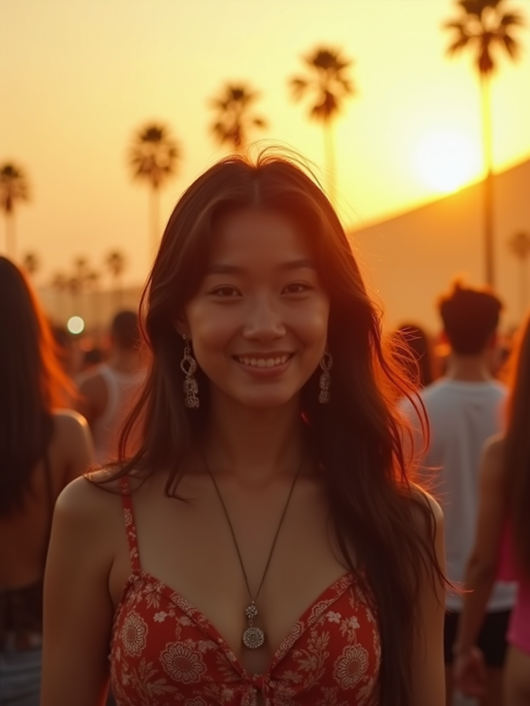 a stunning model surrounded by a group of friends , capturing the sense of community and celebration at Coachella as the sun sets over the palm trees
