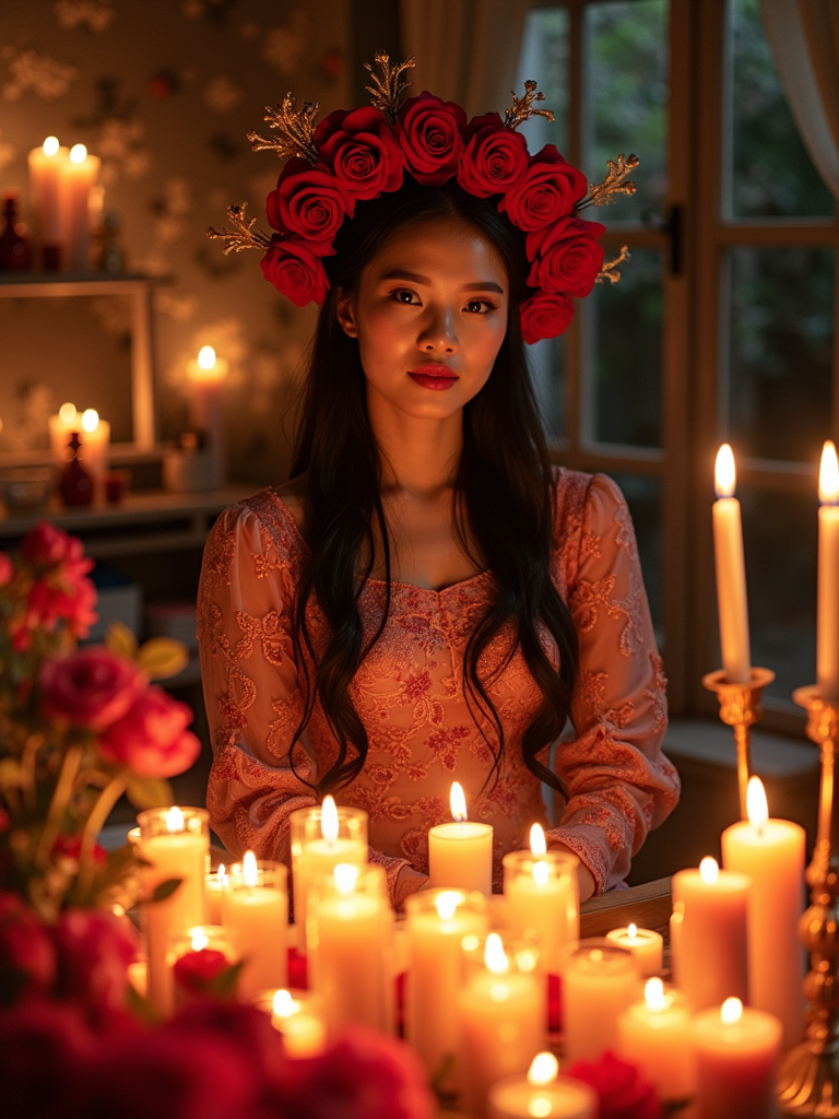 a stunning model surrounded by beautiful altar decorations and candles , capturing the sense of remembrance and family connection during Día de los Muertos