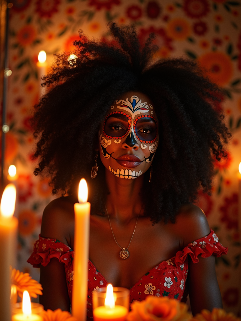 a stunning model surrounded by beautiful altar decorations and candles , capturing the sense of remembrance and family connection during Día de los Muertos