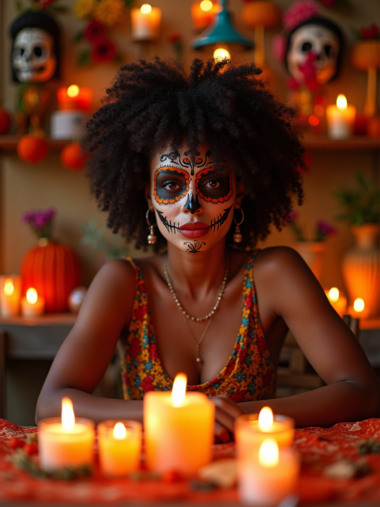 a stunning model surrounded by beautiful altar decorations and candles , capturing the sense of remembrance and family connection during Día de los Muertos