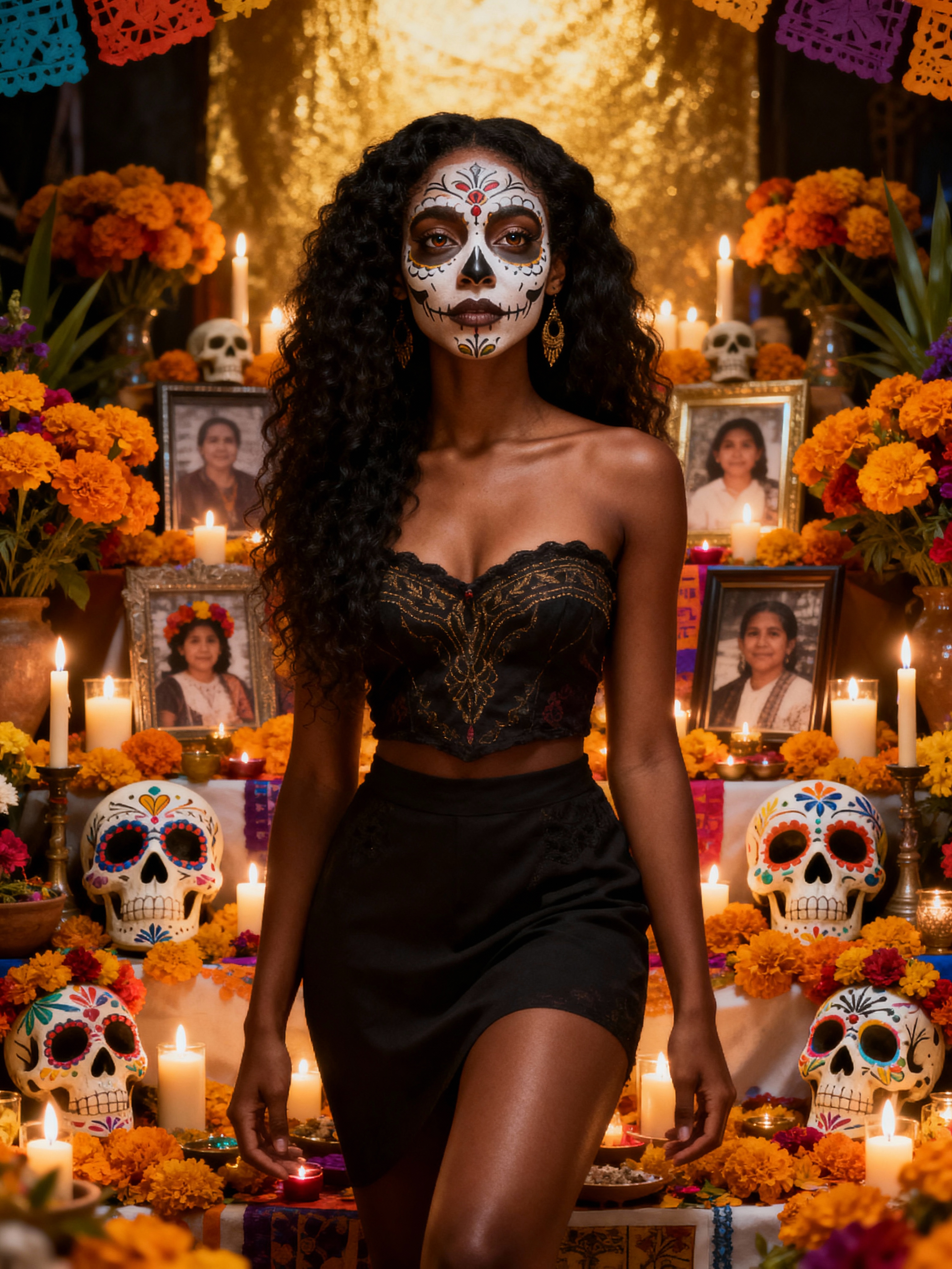 a stunning model surrounded by beautiful altar decorations and candles , capturing the sense of remembrance and family connection during Día de los Muertos
