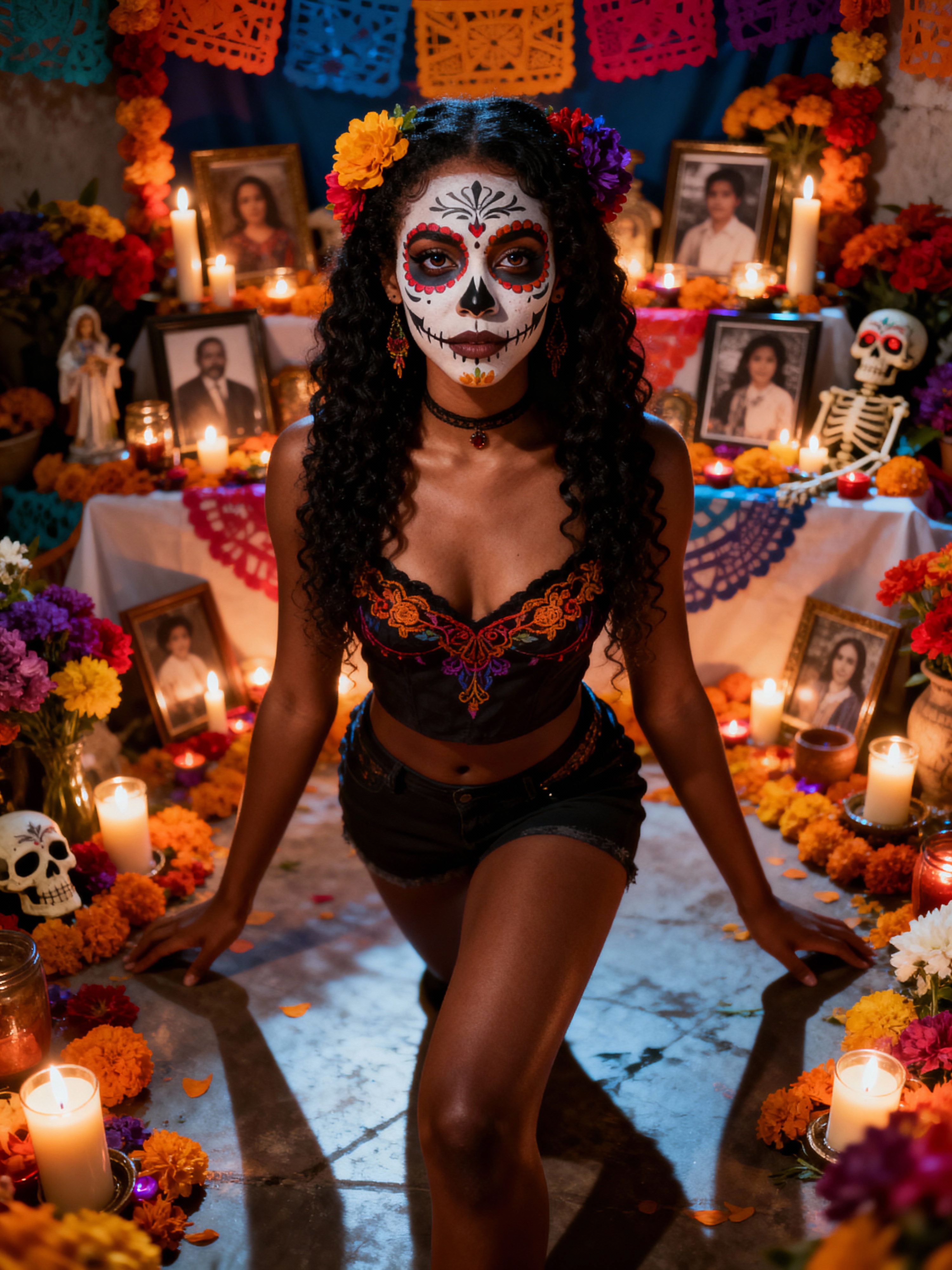 a stunning model surrounded by beautiful altar decorations and candles , capturing the sense of remembrance and family connection during Día de los Muertos