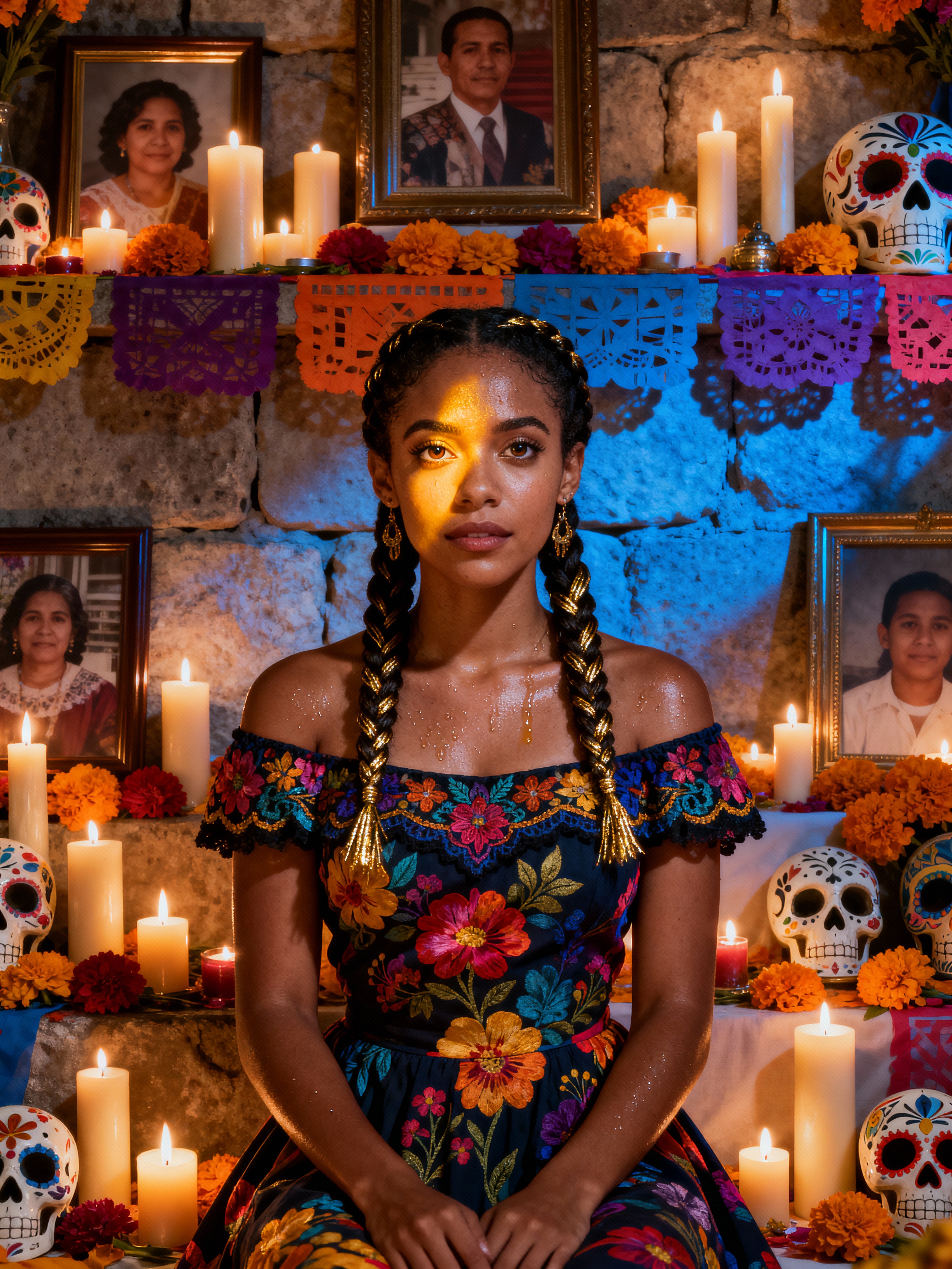 a stunning model surrounded by beautiful altar decorations and candles , capturing the sense of remembrance and family connection during Día de los Muertos