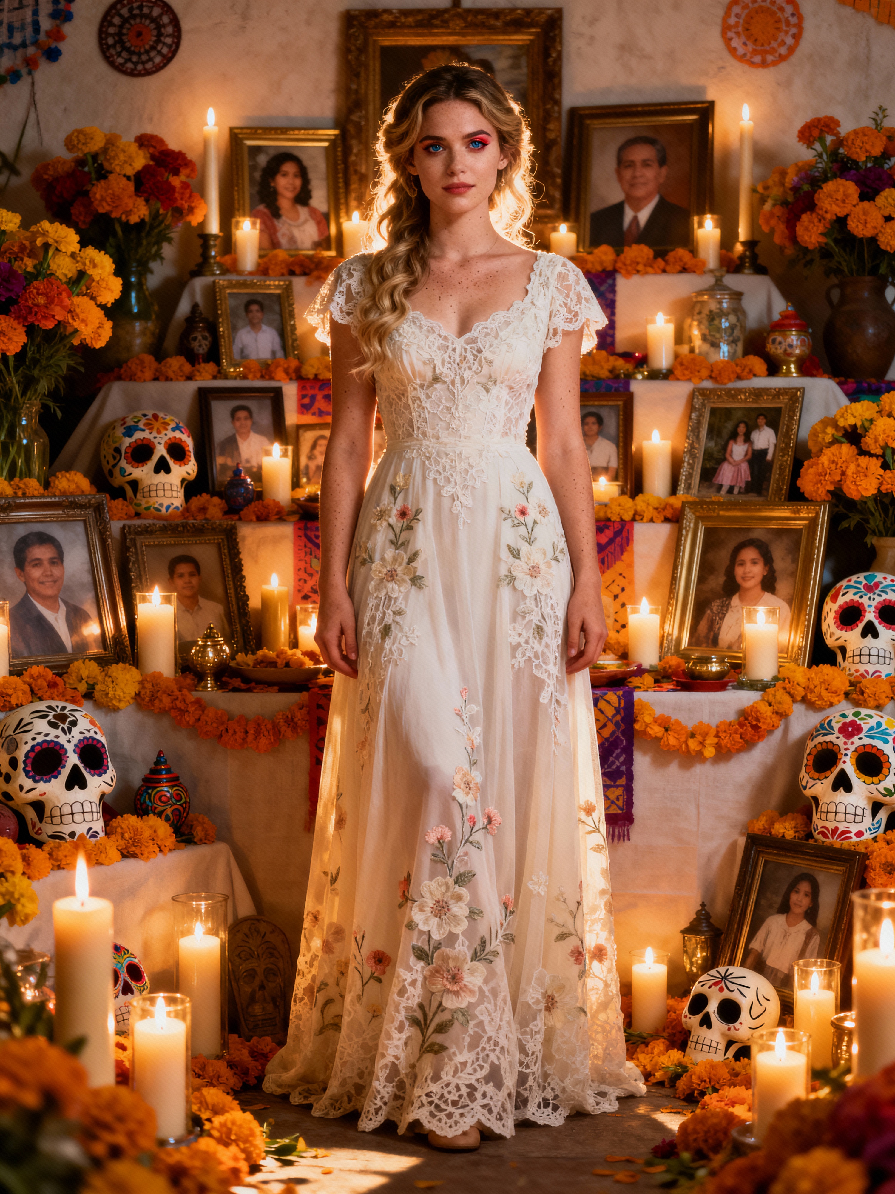 a stunning model surrounded by beautiful altar decorations and candles , capturing the sense of remembrance and family connection during Día de los Muertos