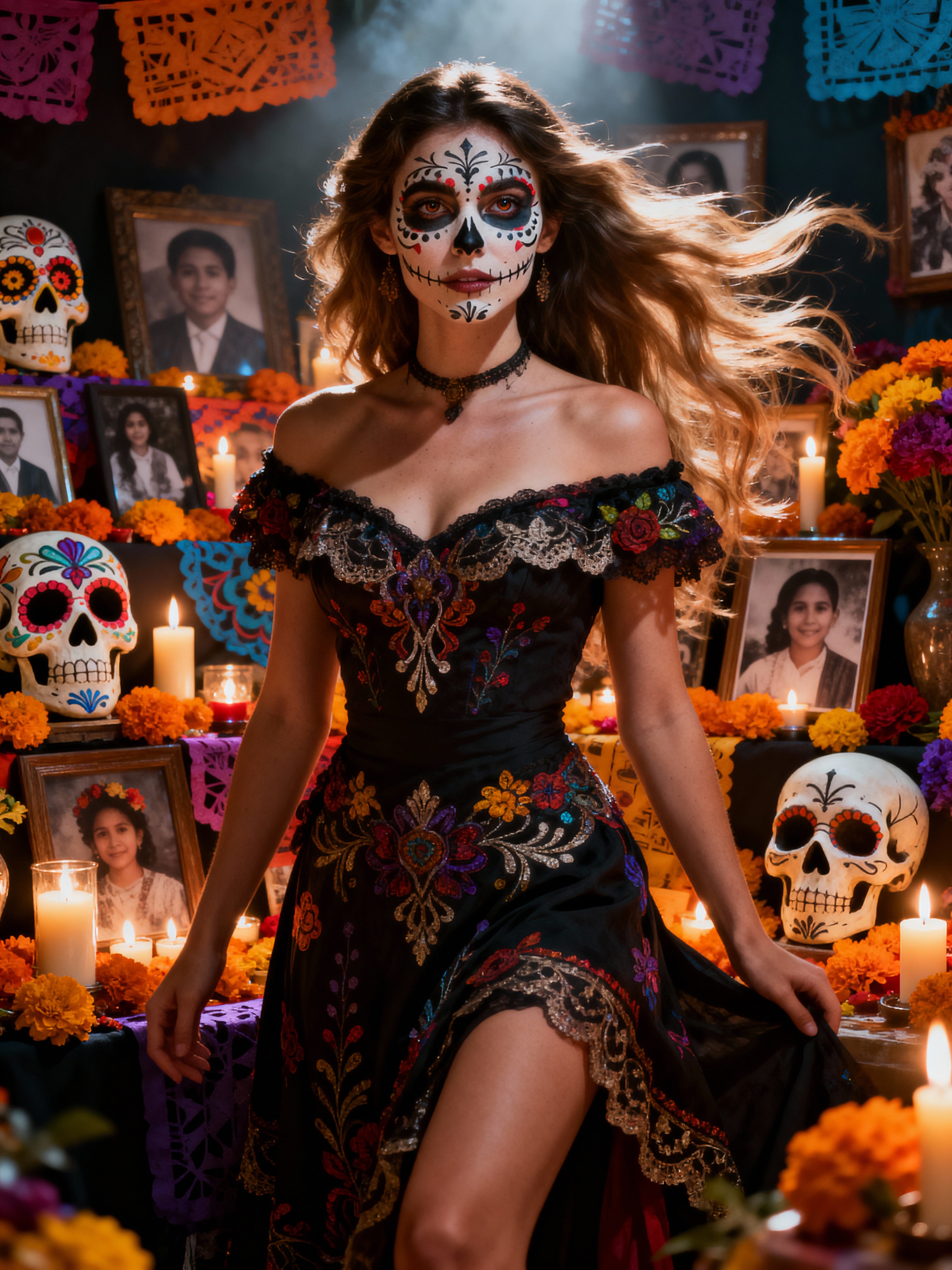 a stunning model surrounded by beautiful altar decorations and candles , capturing the sense of remembrance and family connection during Día de los Muertos