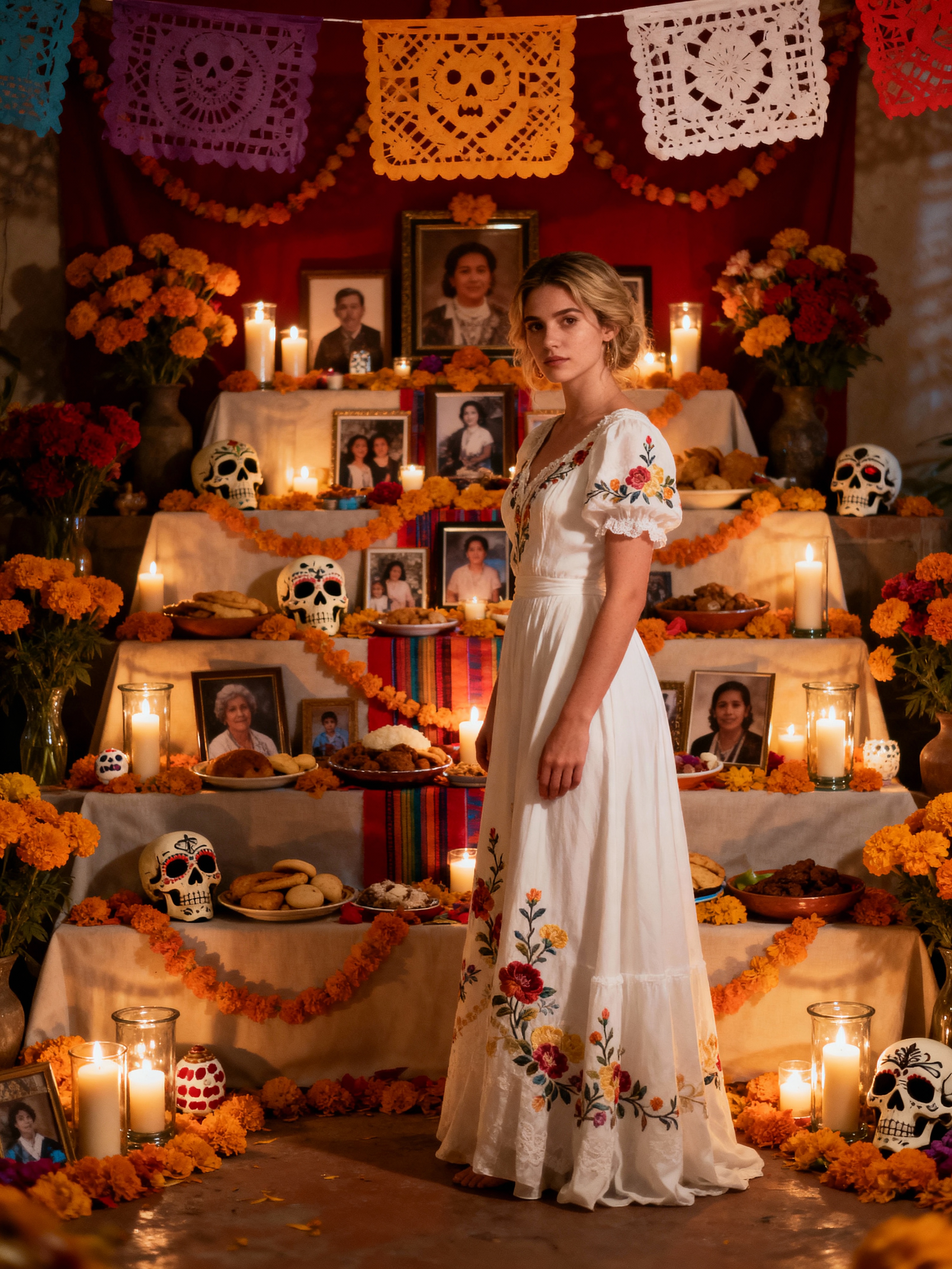 a stunning model surrounded by beautiful altar decorations and candles , capturing the sense of remembrance and family connection during Día de los Muertos