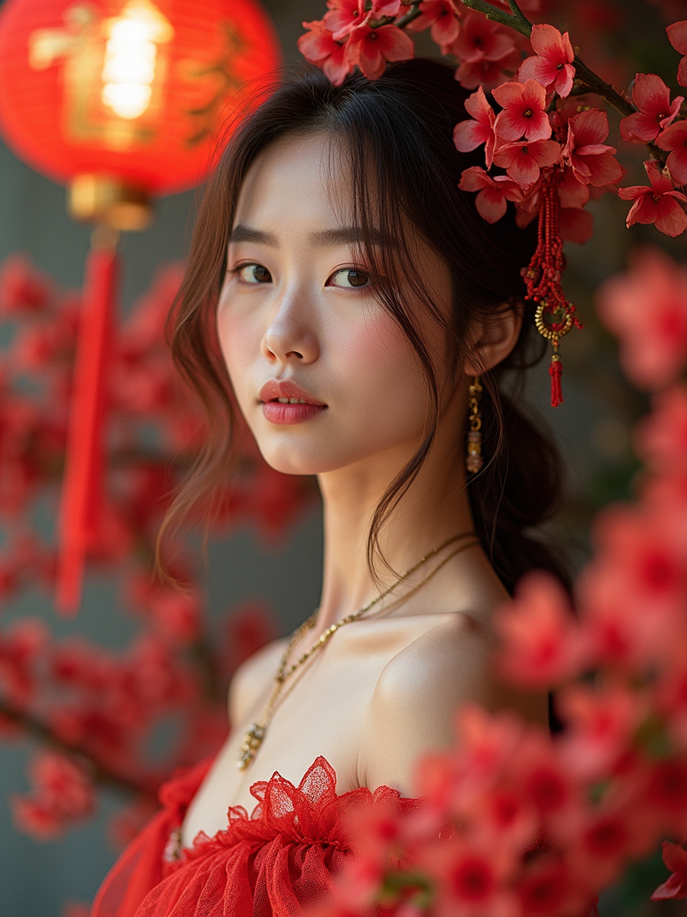 a stunning model surrounded by beautiful Chinese New Year flowers and plants , capturing the sense of renewal and family connection during the Spring Festival