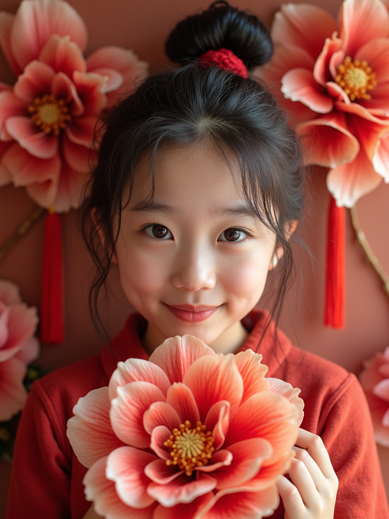 a stunning model surrounded by beautiful Chinese New Year flowers and plants , capturing the sense of renewal and family connection during the Spring Festival