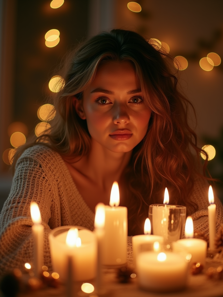 a stunning model surrounded by beautiful Eid decorations and candles , capturing the sense of joy and family connection during the holiday