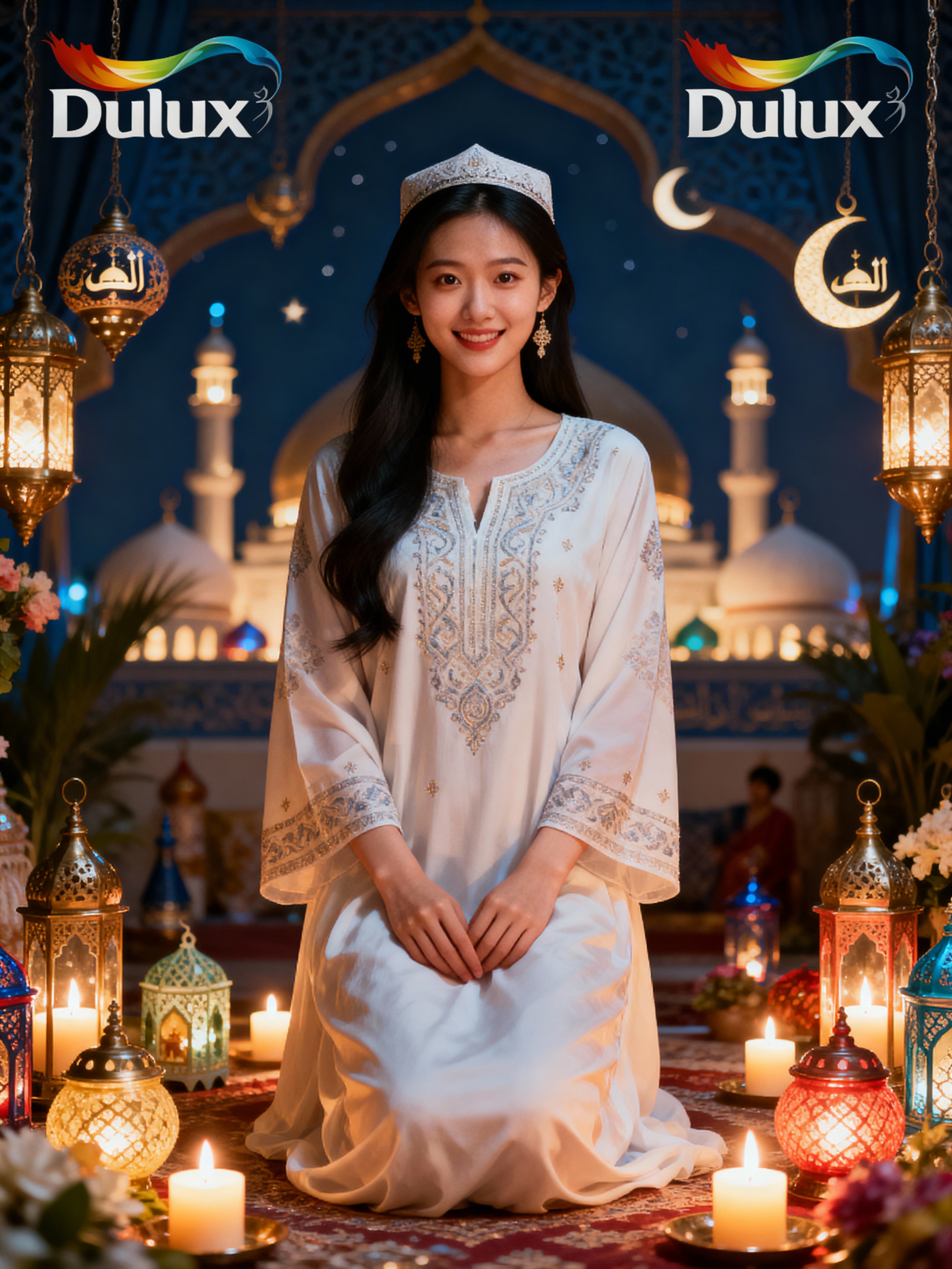 a stunning model surrounded by beautiful Eid decorations and candles , capturing the sense of joy and family connection during the holiday
