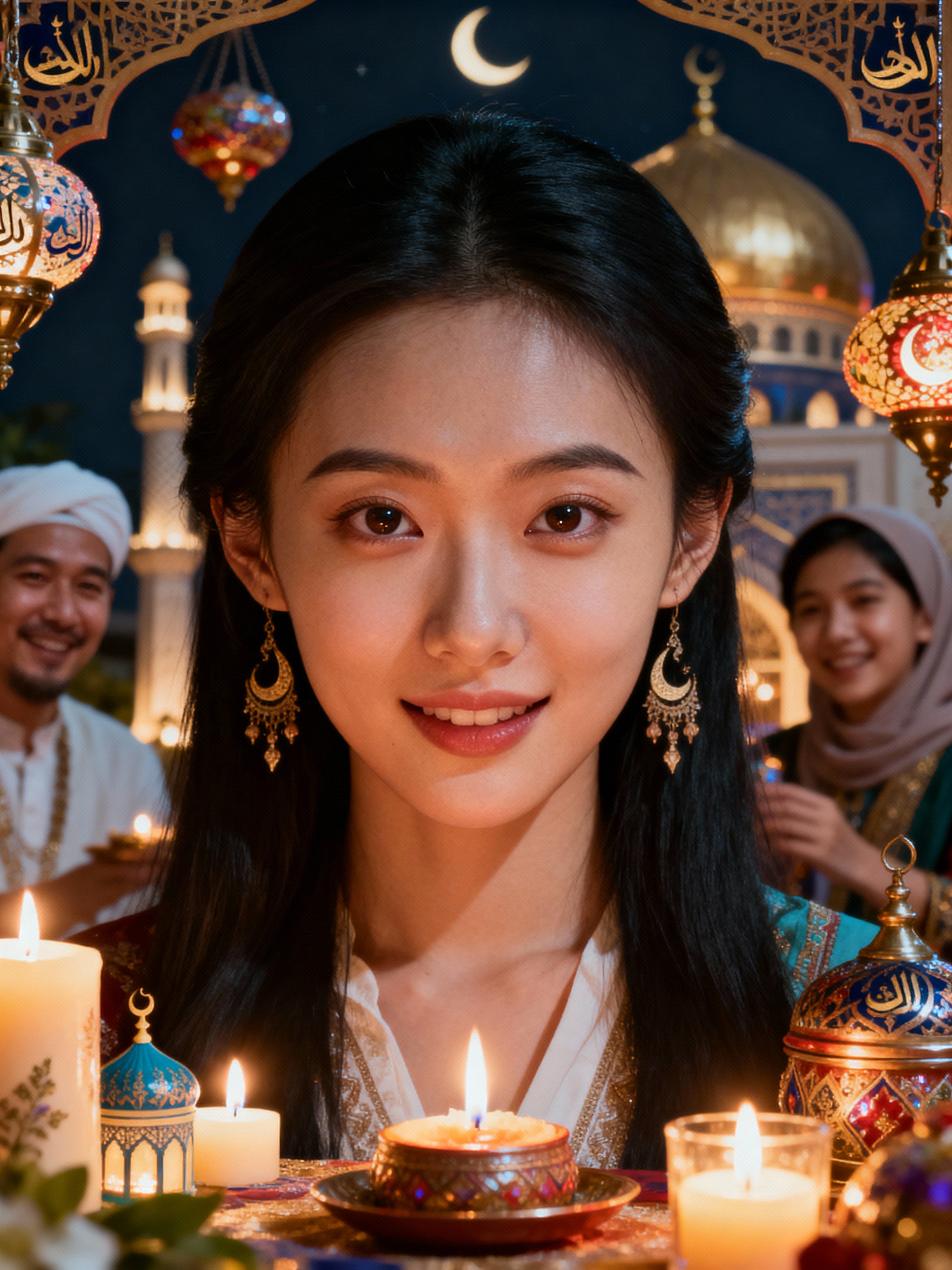 a stunning model surrounded by beautiful Eid decorations and candles , capturing the sense of joy and family connection during the holiday