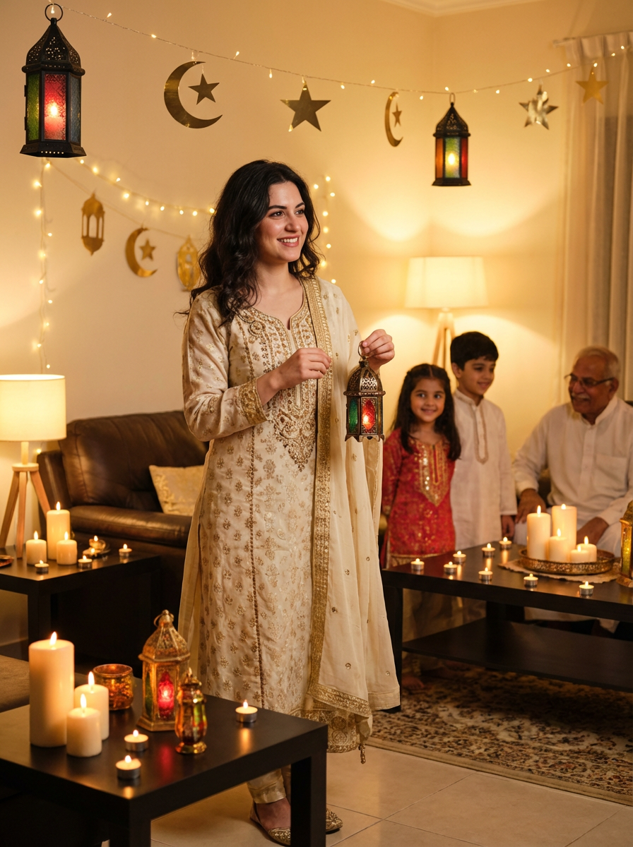 a stunning model surrounded by beautiful Eid decorations and candles , capturing the sense of joy and family connection during the holiday