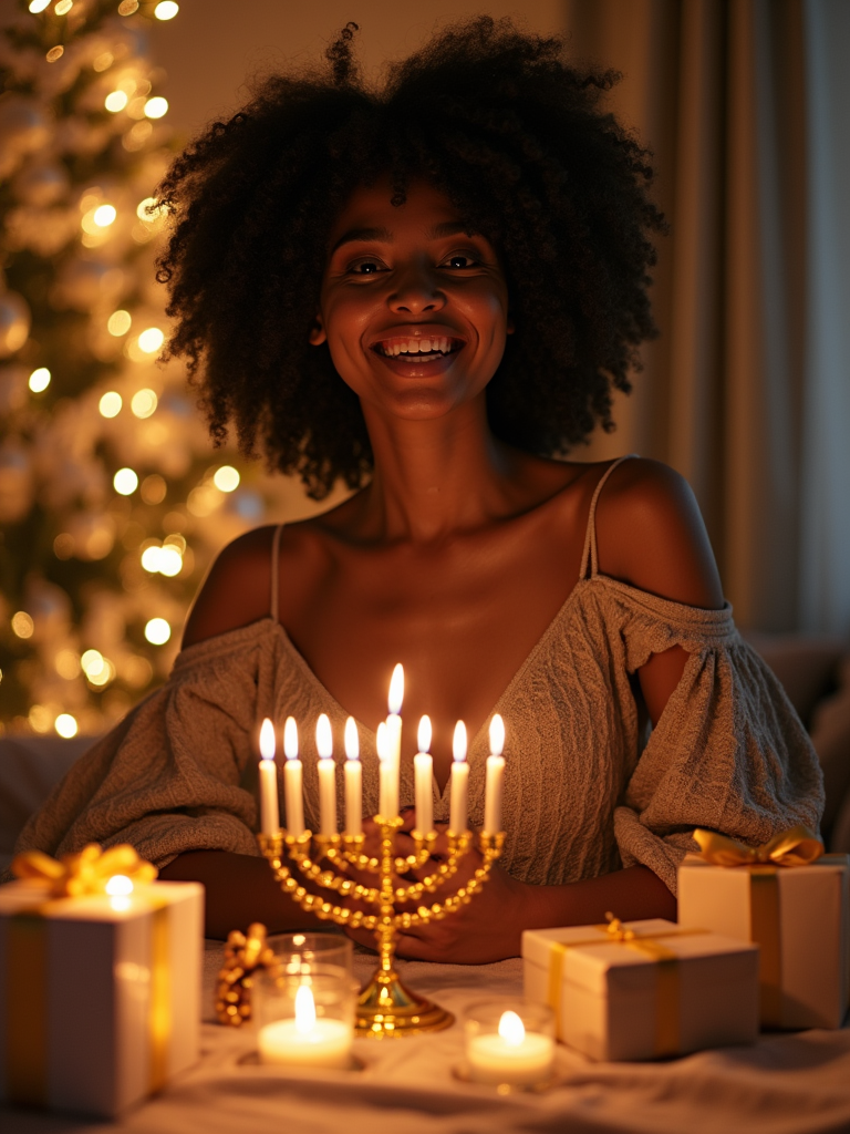 a stunning model surrounded by beautiful Hanukkah decorations and gifts , capturing the sense of miracle and family connection during the Festival of Lights