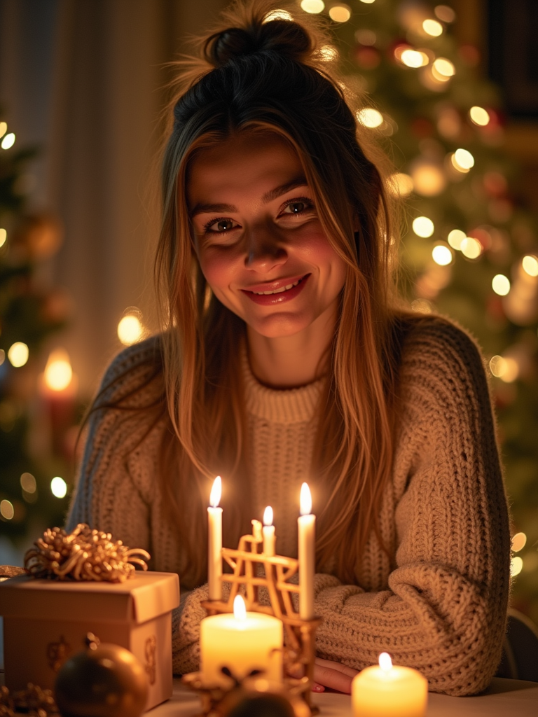 a stunning model surrounded by beautiful Hanukkah decorations and gifts , capturing the sense of miracle and family connection during the Festival of Lights