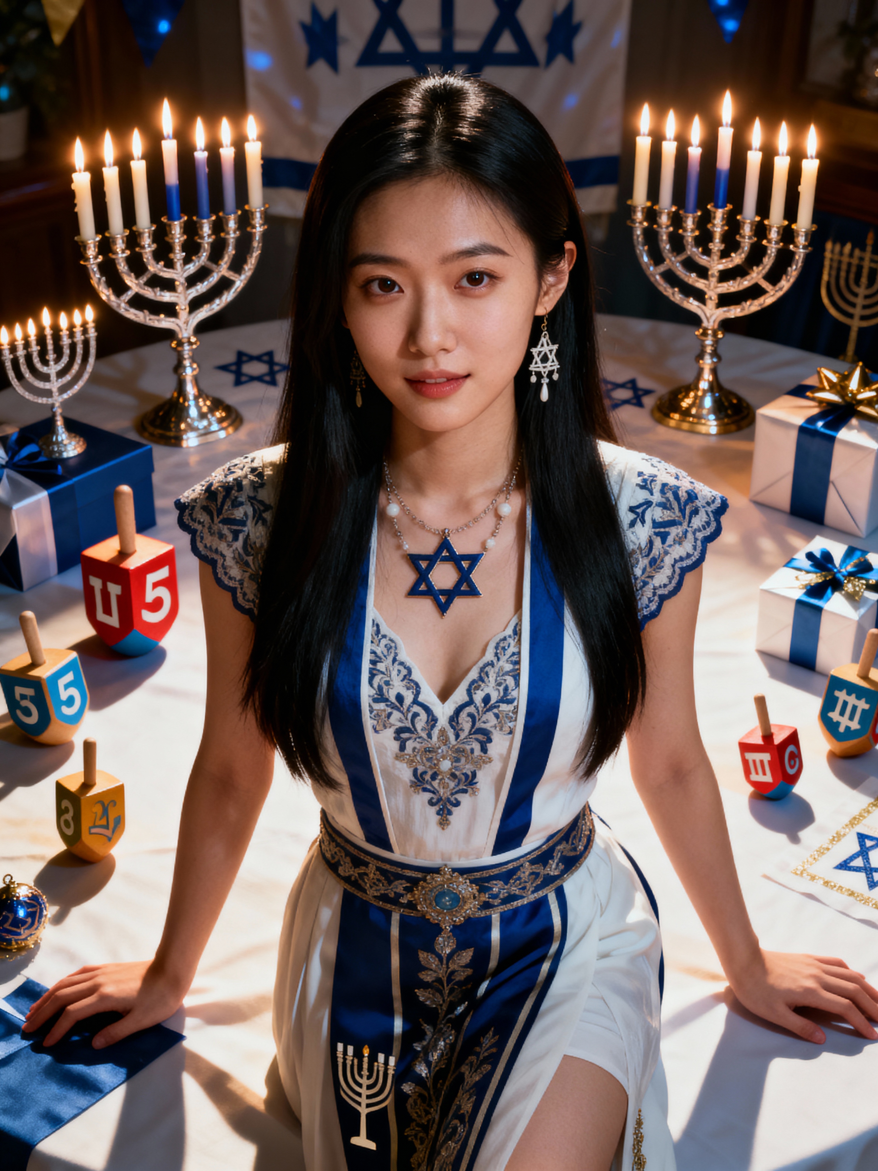 a stunning model surrounded by beautiful Hanukkah decorations and gifts , capturing the sense of miracle and family connection during the Festival of Lights