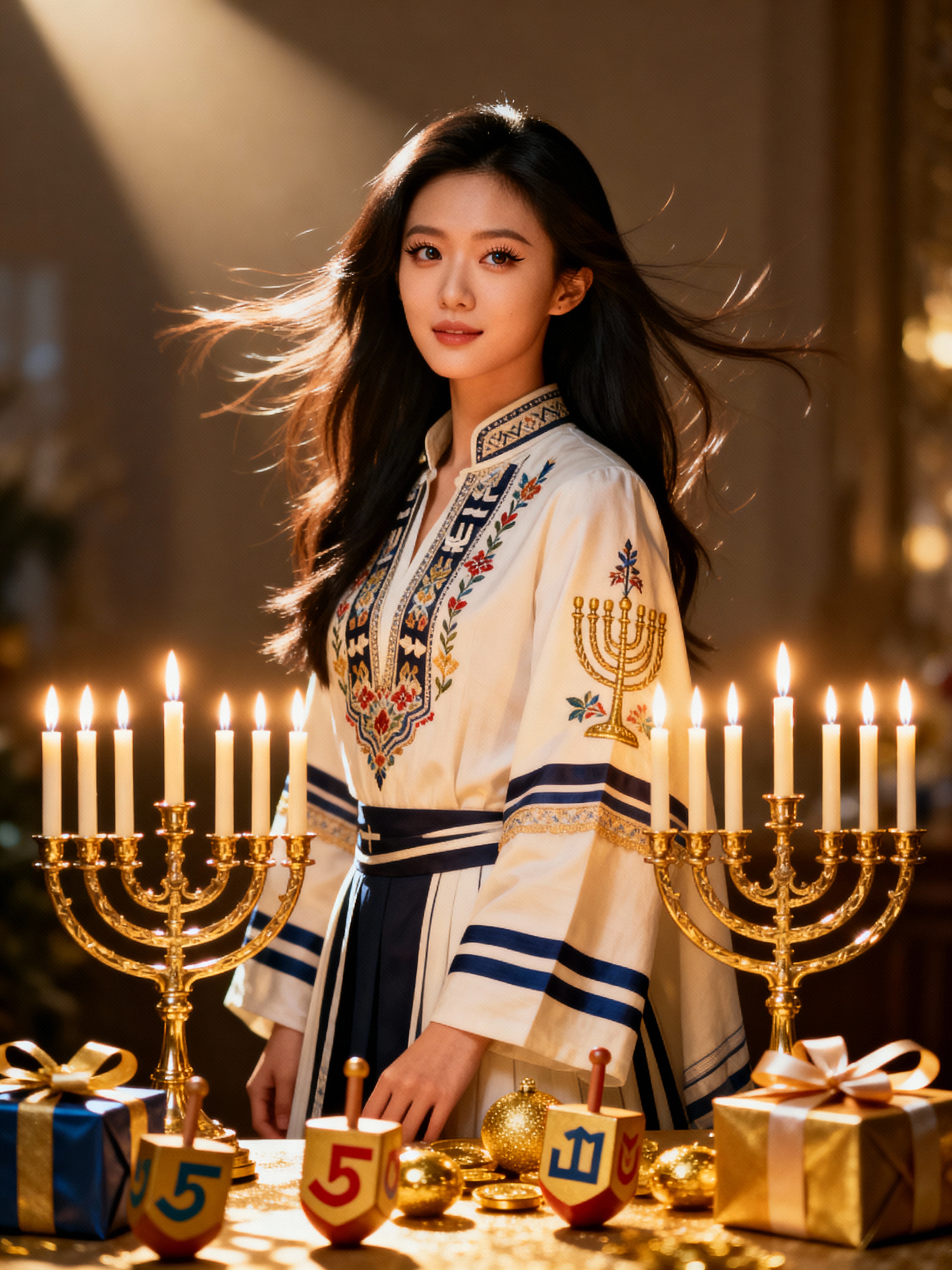 a stunning model surrounded by beautiful Hanukkah decorations and gifts , capturing the sense of miracle and family connection during the Festival of Lights